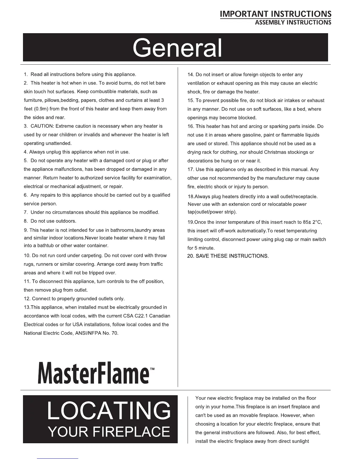 MASTERFLAME HAMILTON - General Operating Instructions; General Safety Precautions for Use