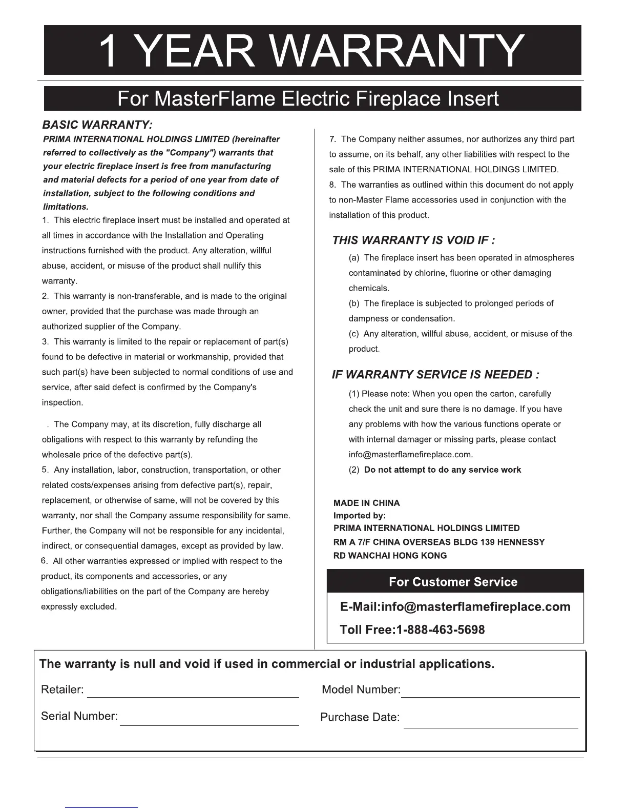 MASTERFLAME HAMILTON - 1 Year Limited Warranty; Warranty Conditions and Exclusions