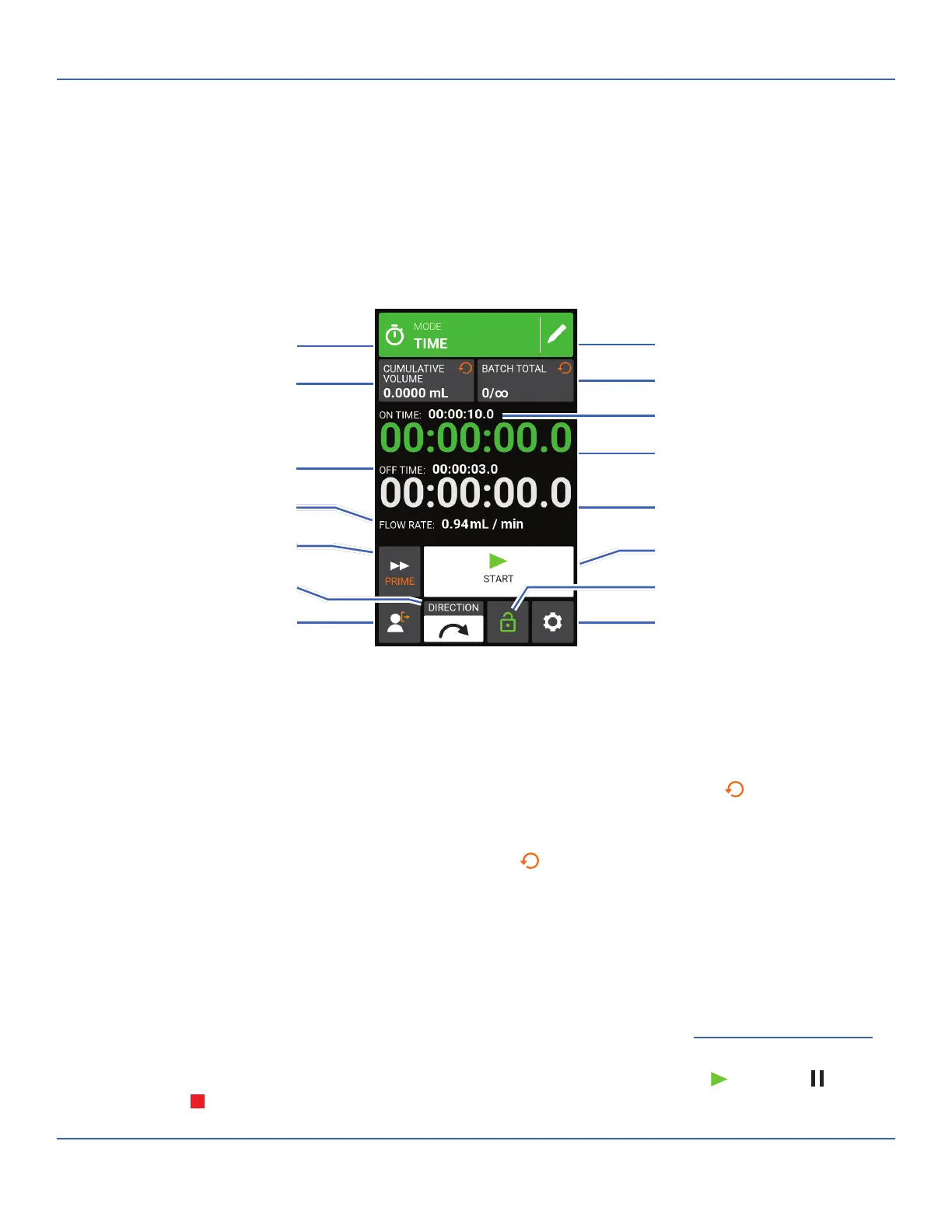 In Time Mode the pump will operate at a selected rpm and/or ow rate for a selected time and/or batch total.