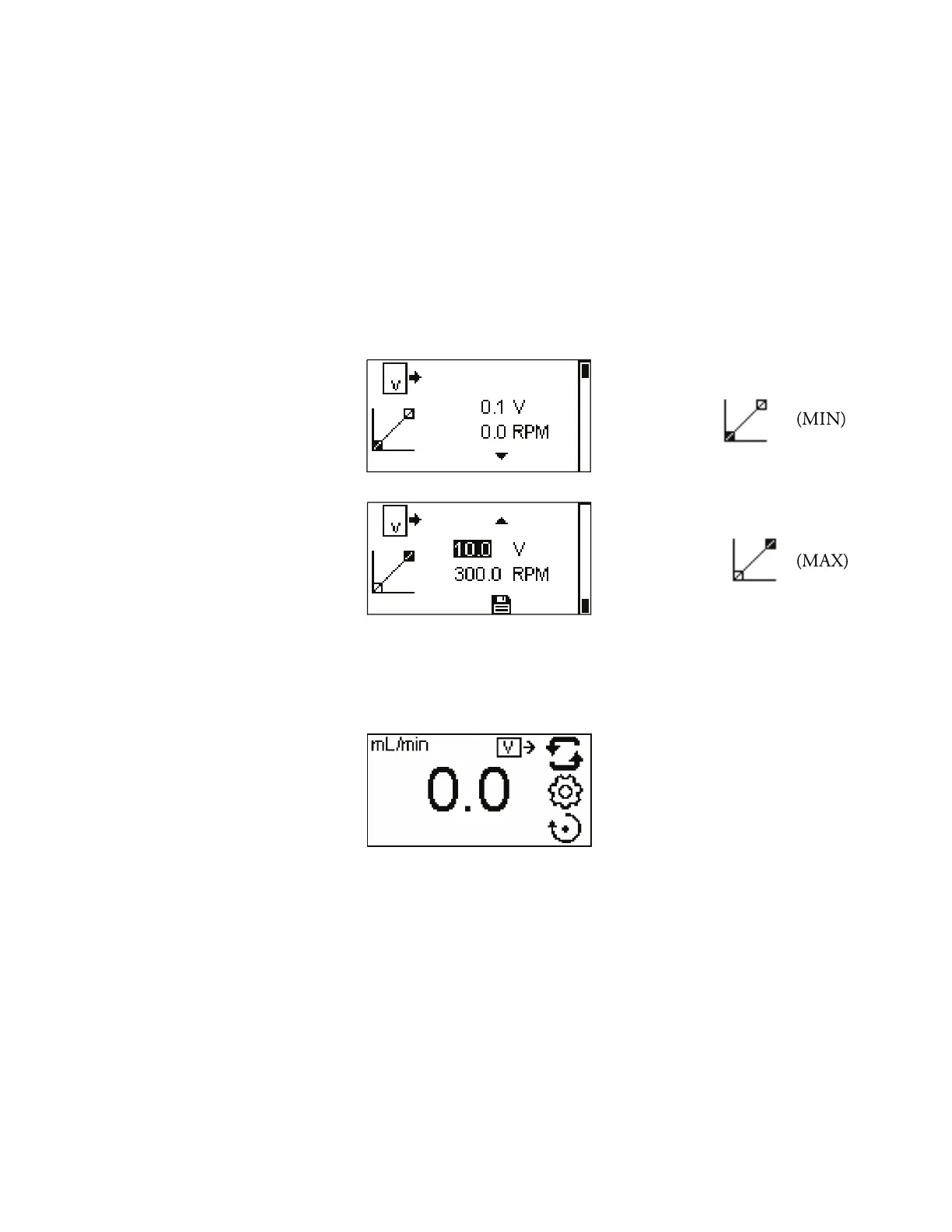 (MIN) voltage is set to 1V DC and the RPM is set to 0.0. e maximum