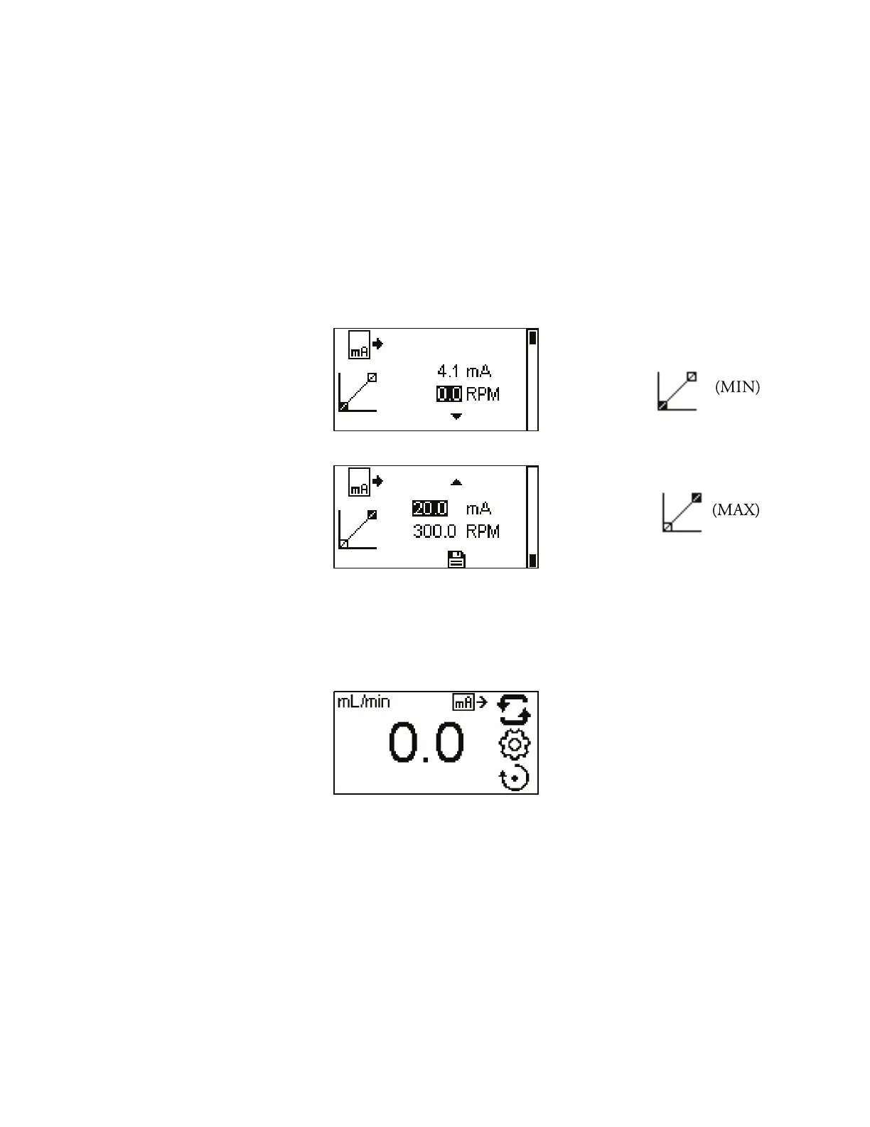 minimum (MIN) RPM is set to 0.0 and the current is set to 4.1 mA.
