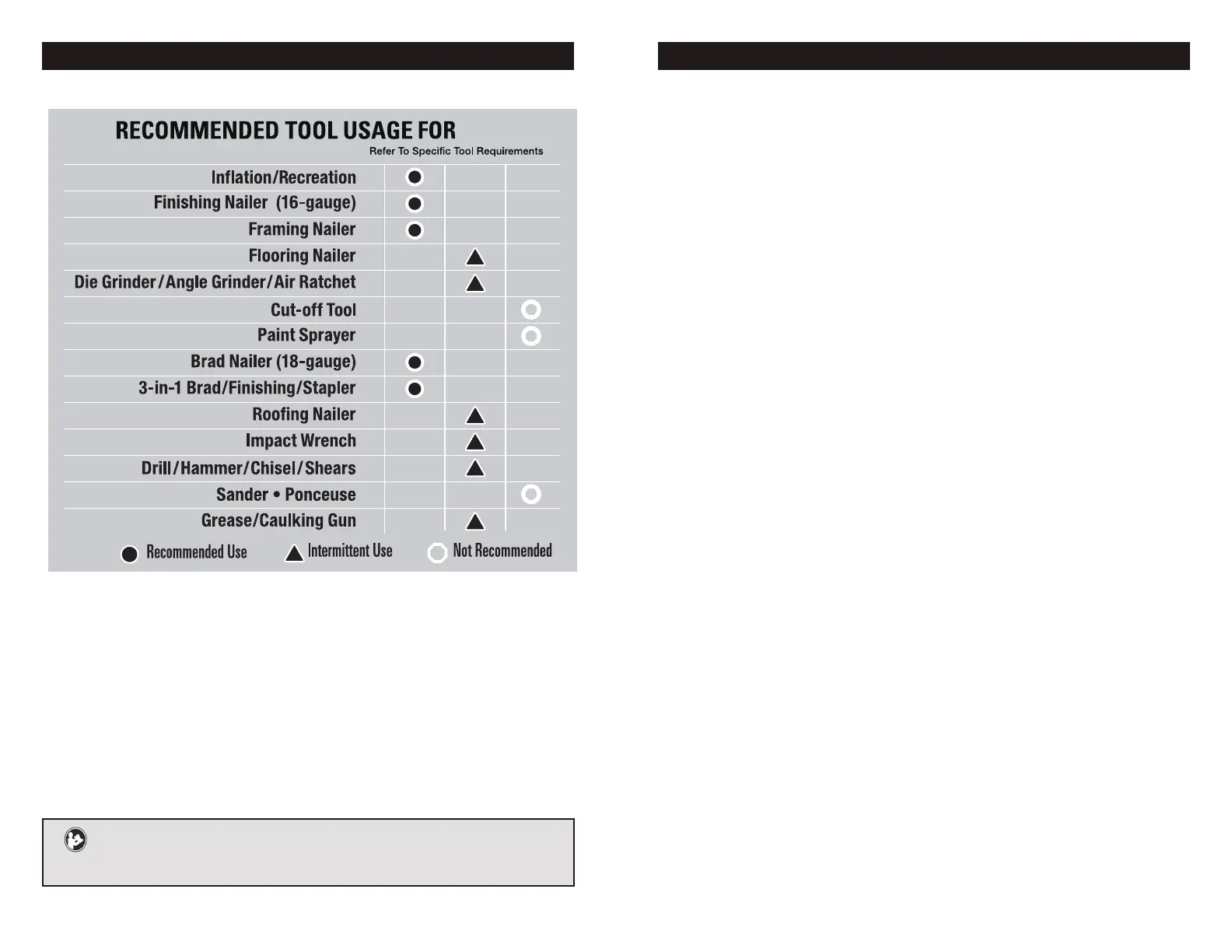 Always ensure the use of appropriately matched air tools with your air compressor. Be