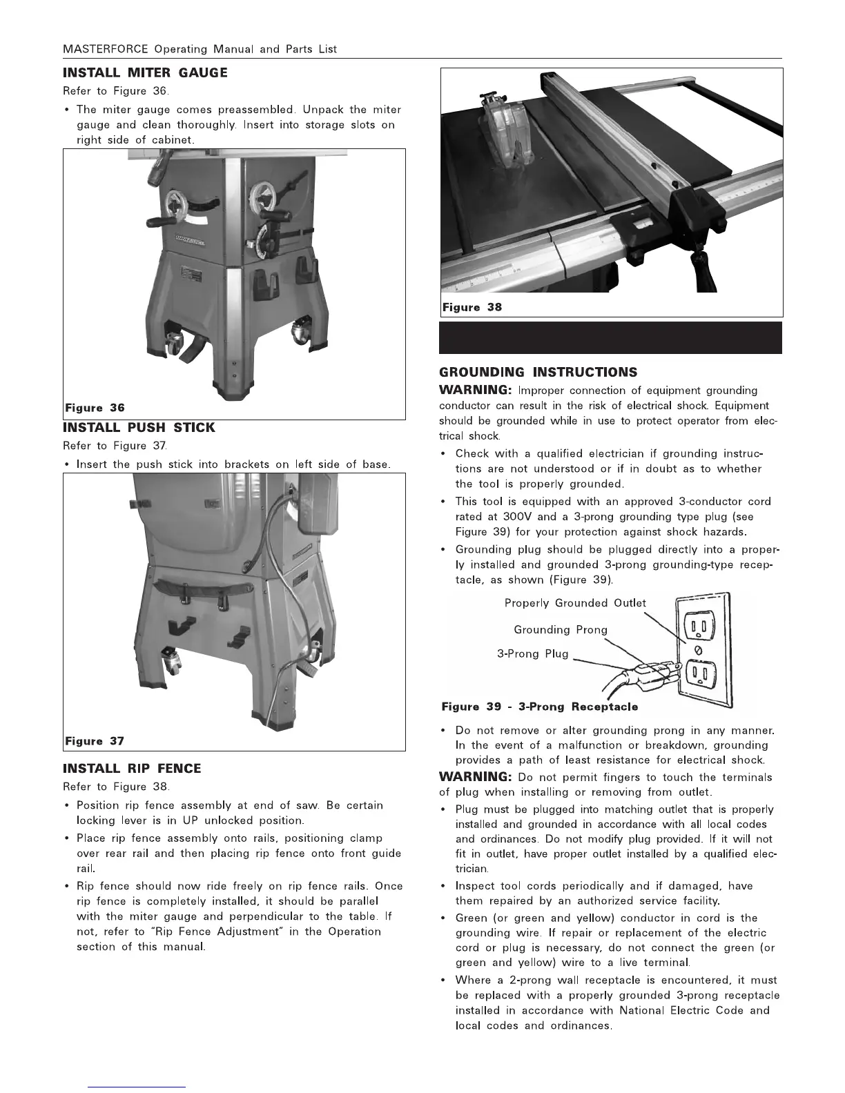 MasterForce 240-0037 - Installation and Connections; Installing Guides and Rip Fence; Grounding and Electrical Connections