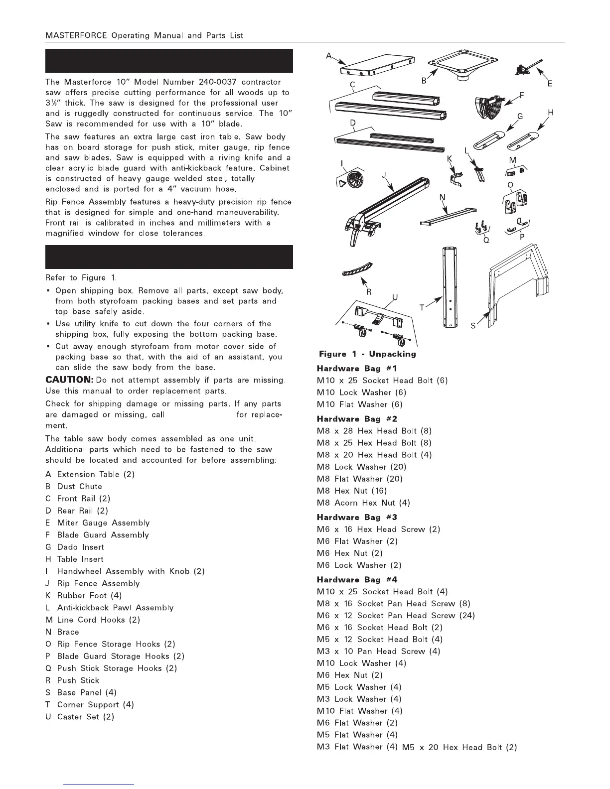 MasterForce 240-0037 - Product Overview and Safety; Product Description; Unpacking the Table Saw