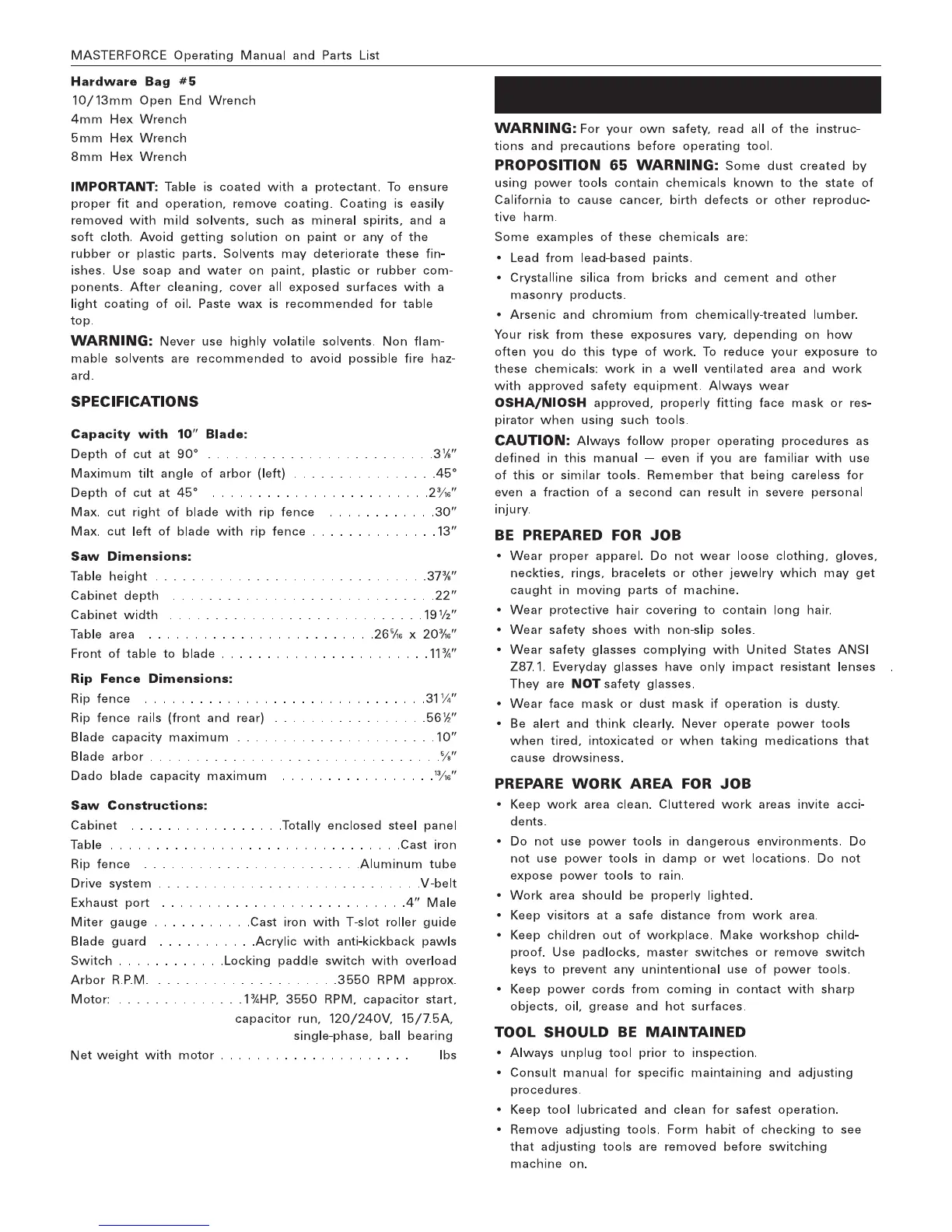 MasterForce 240-0037 - Saw Specifications and Dimensions; Essential Safety Rules and Preparation