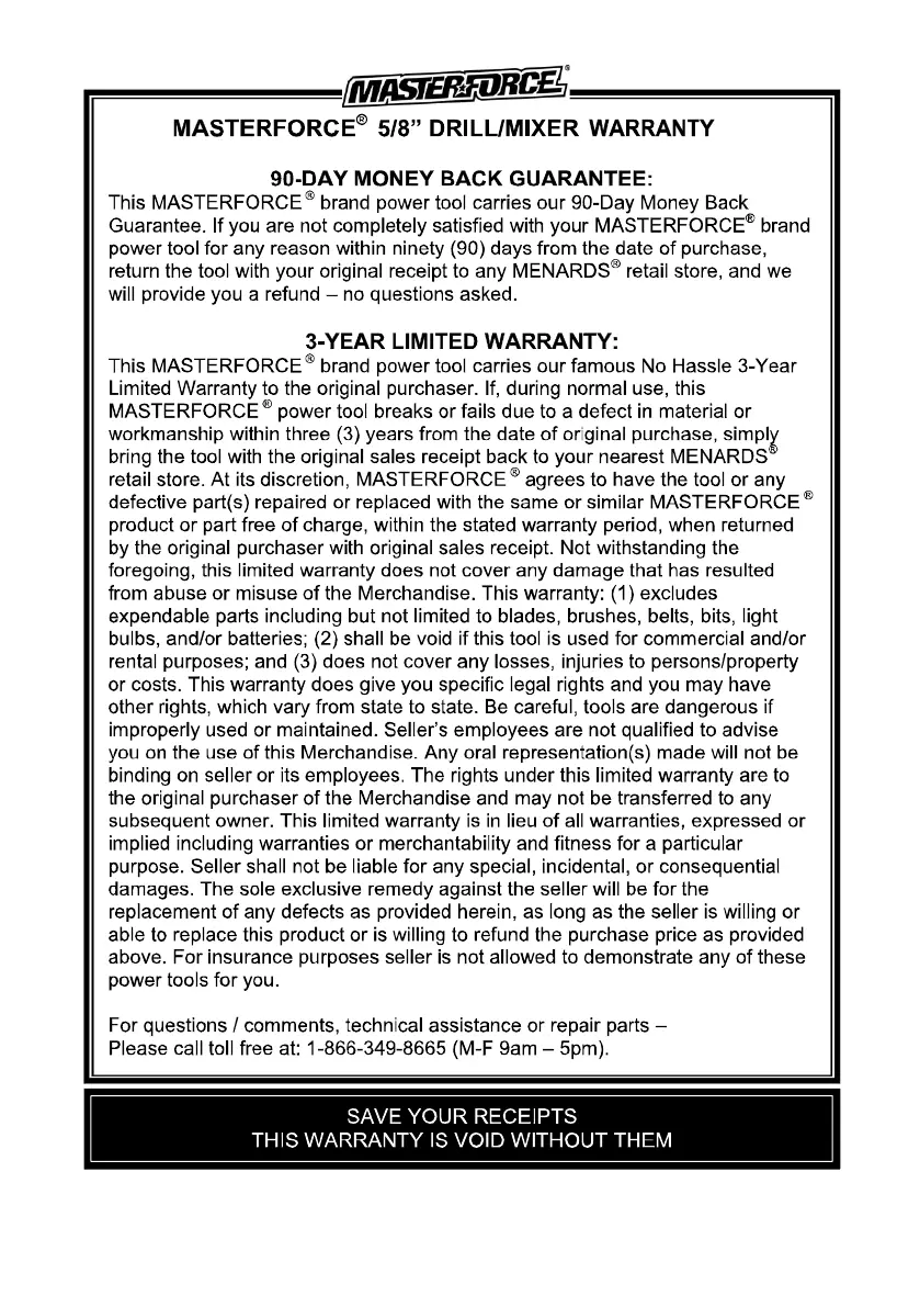 MasterForce 241-0725 - PRODUCT WARRANTY DETAILS; 90-DAY GUARANTEE POLICY; 3-YEAR LIMITED WARRANTY POLICY