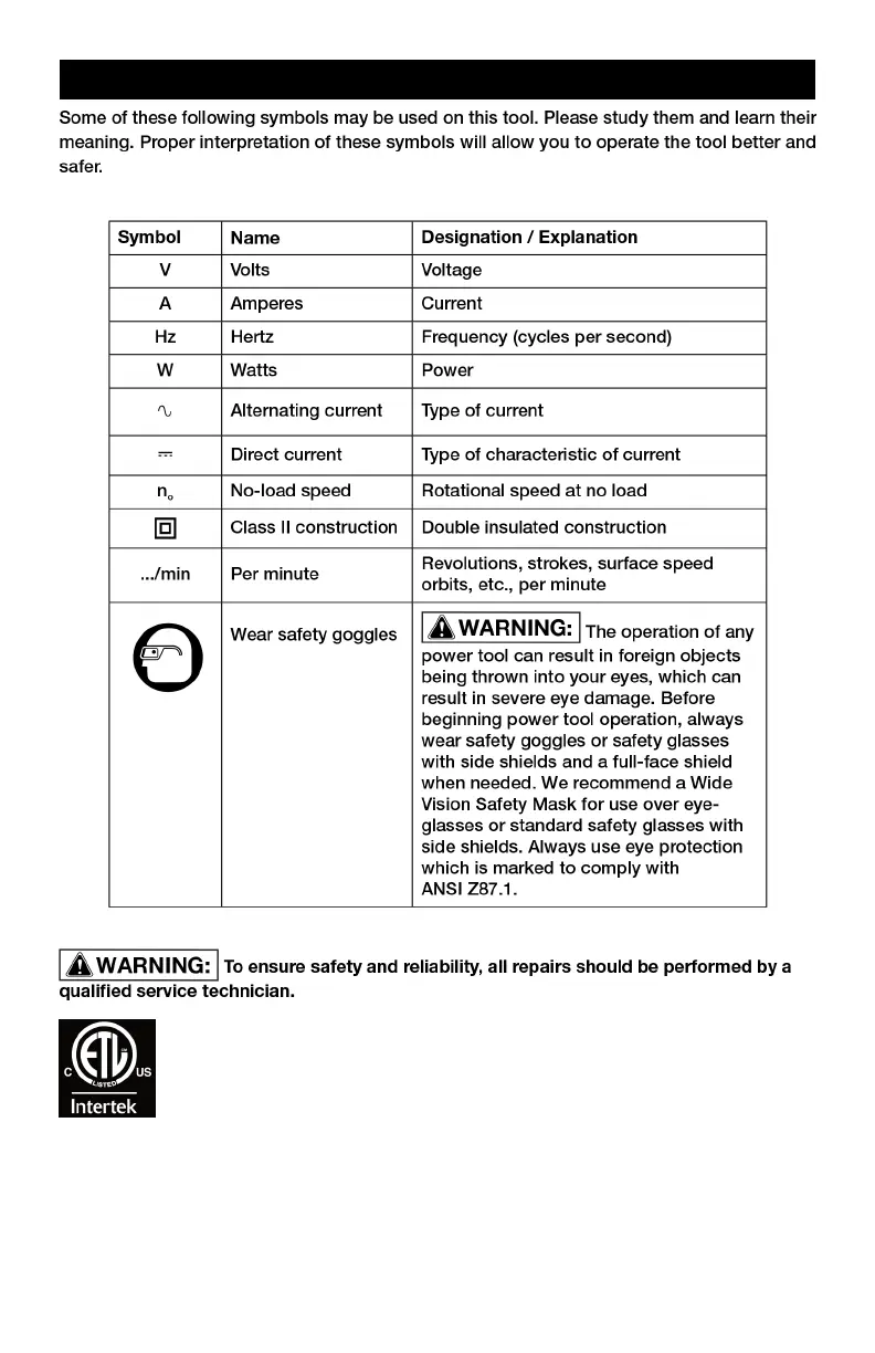 THIS SYMBOL DESIGNATES THAT THIS TOOL IS LISTED BY THE INTERTEK