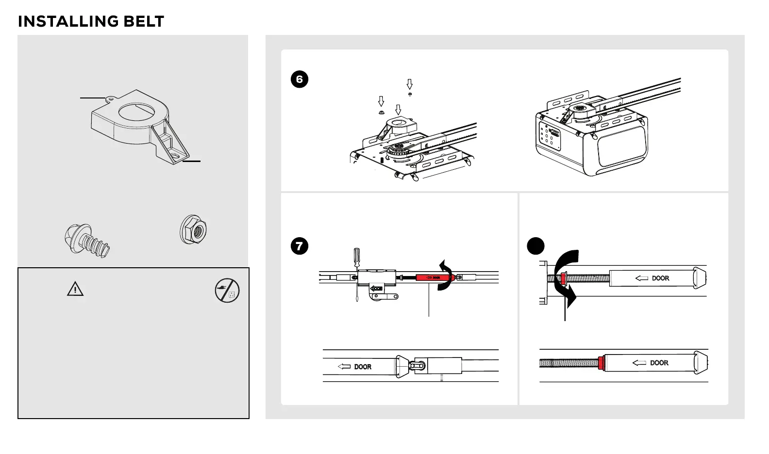 Aer the belt is connected, attach the Sprocket Cover to the opener with the screw and nut provided.