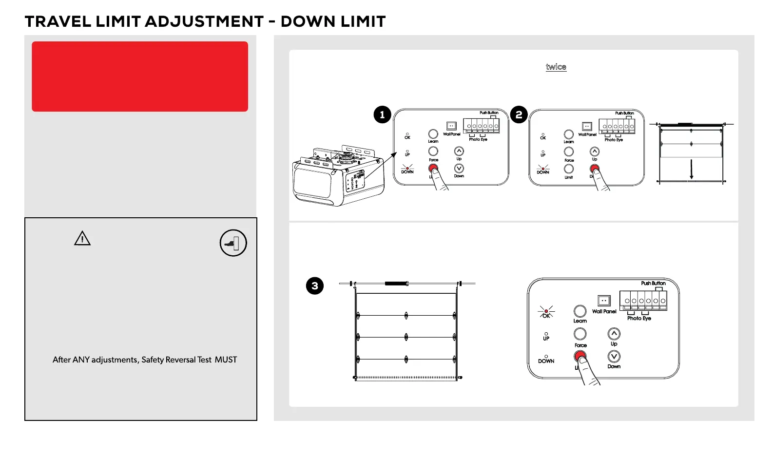 With door in the open position, press and release “Limit” button twice, the red (DOWN) LED will illuminate.