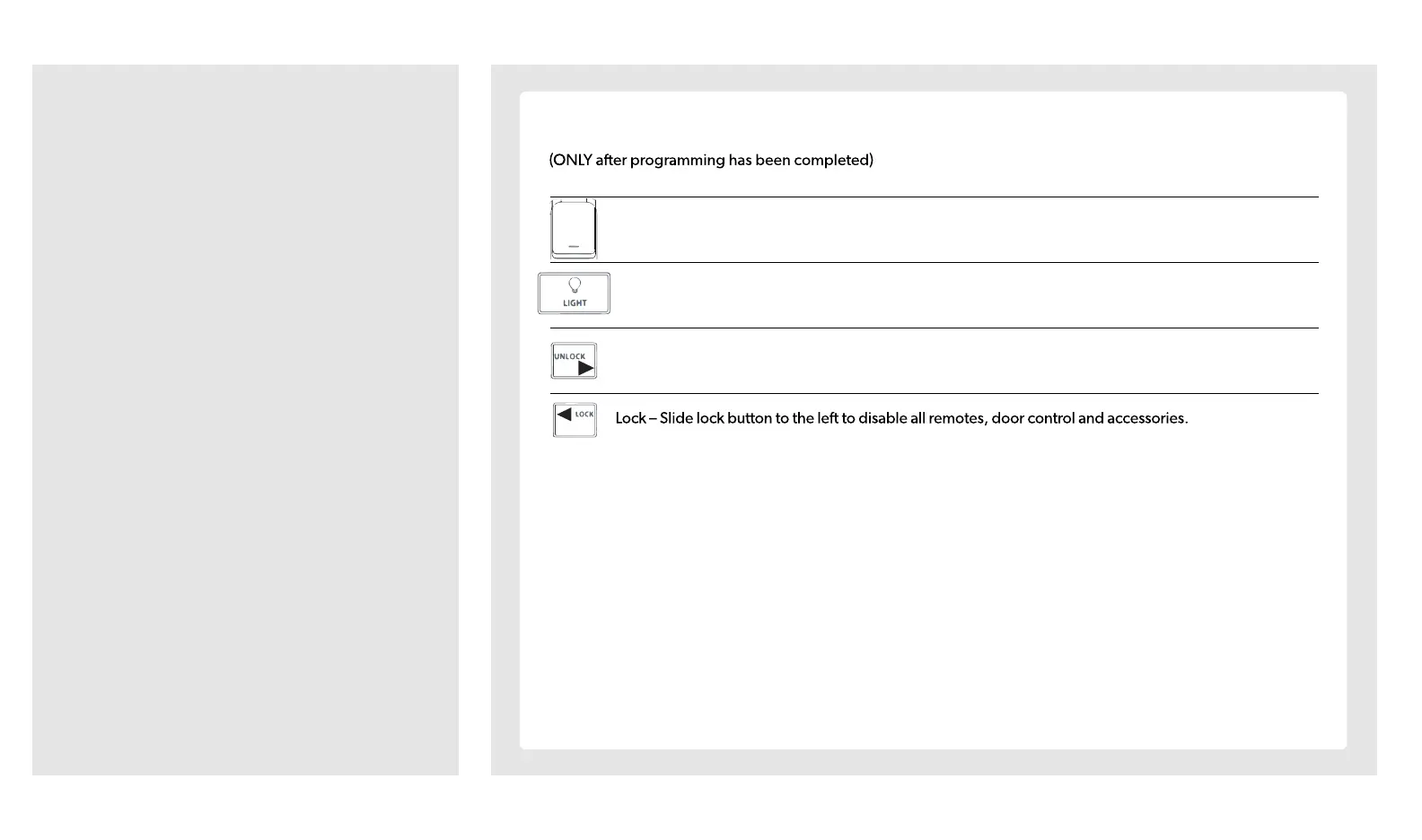 Unlock – Slide lock button to the right to enable all remotes, door control and accessories.