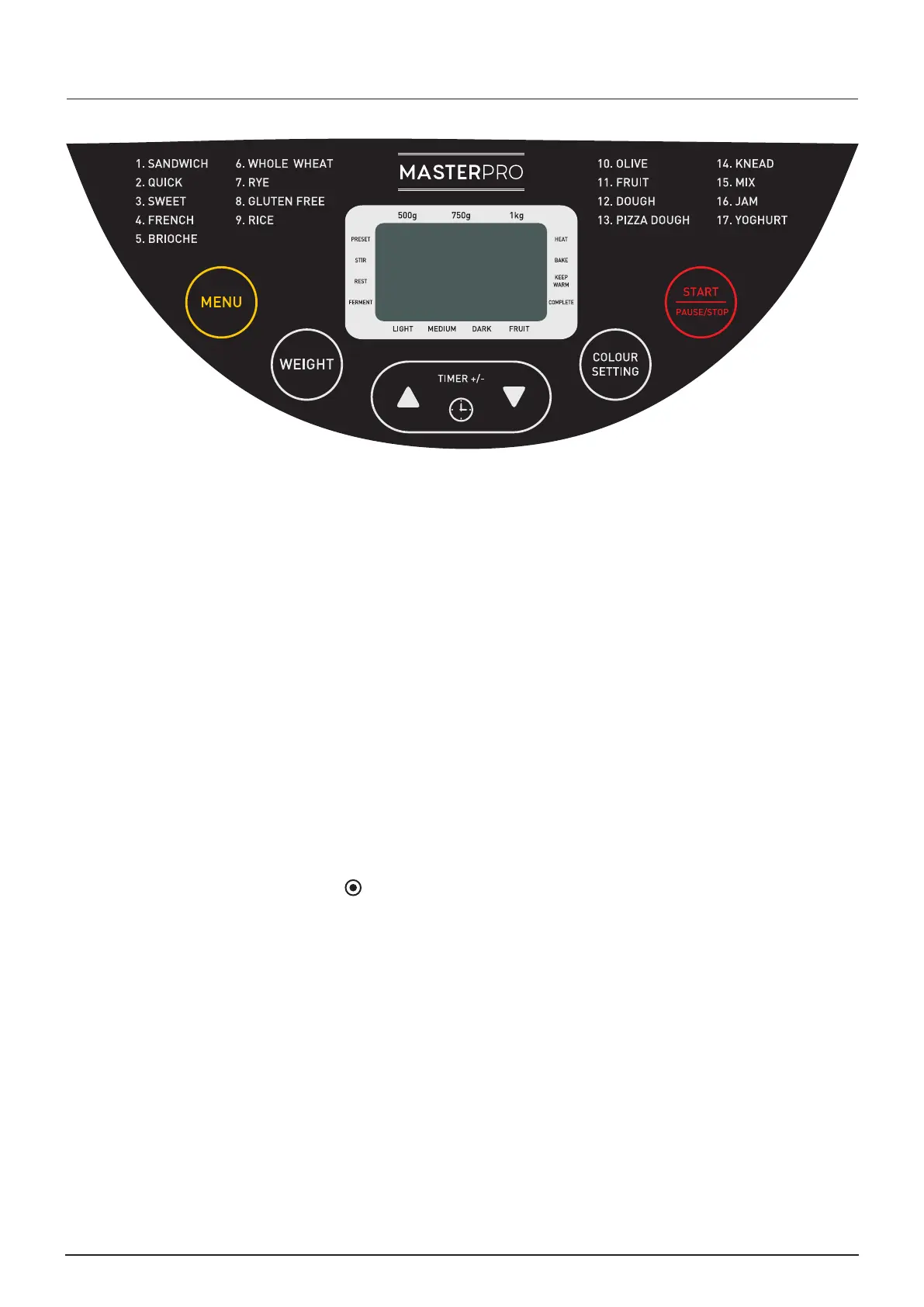 COLOUR Press COLOUR SETTING to select desired crust colour: light, medium, or dark.