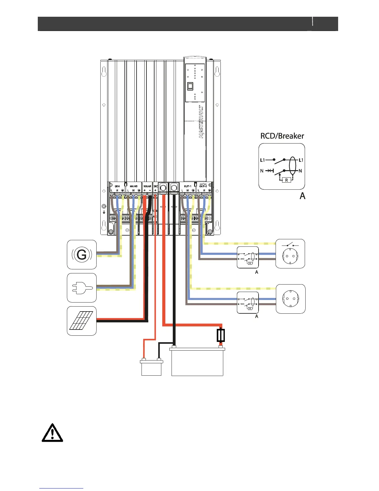 Ensure correct polarities, cross sections and fuses for all wiring. An RCD according to local regulations must be