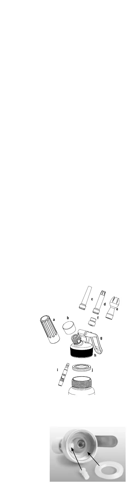 Reinigung: Den Kopf von der Flasche lösen, dann den Dichtring, die Spritzdüse