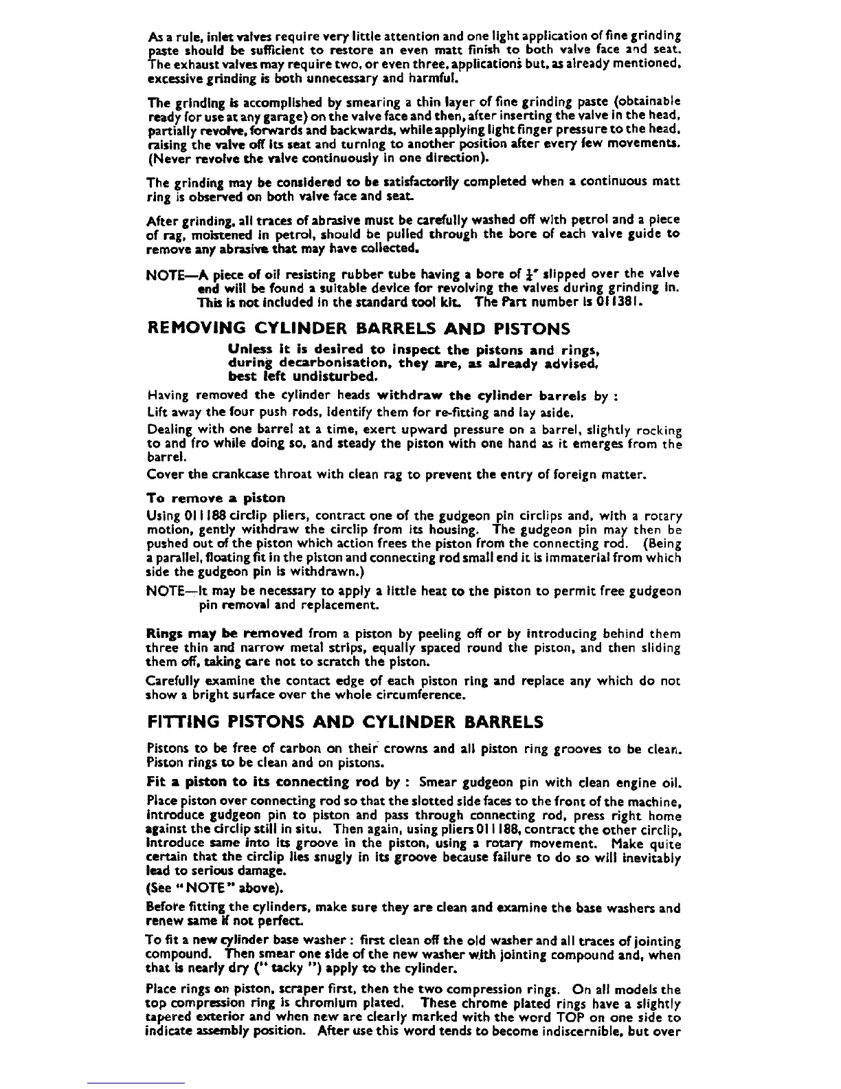 Matchless G11 - Removing Cylinder Barrels and Pistons; Fitting Pistons and Cylinder Barrels