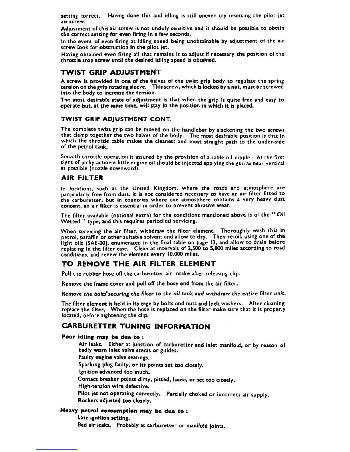 Matchless G11 - Twist Grip Adjustment; Air Filter; To Remove the Air Filter Element; Carburetter Tuning Information