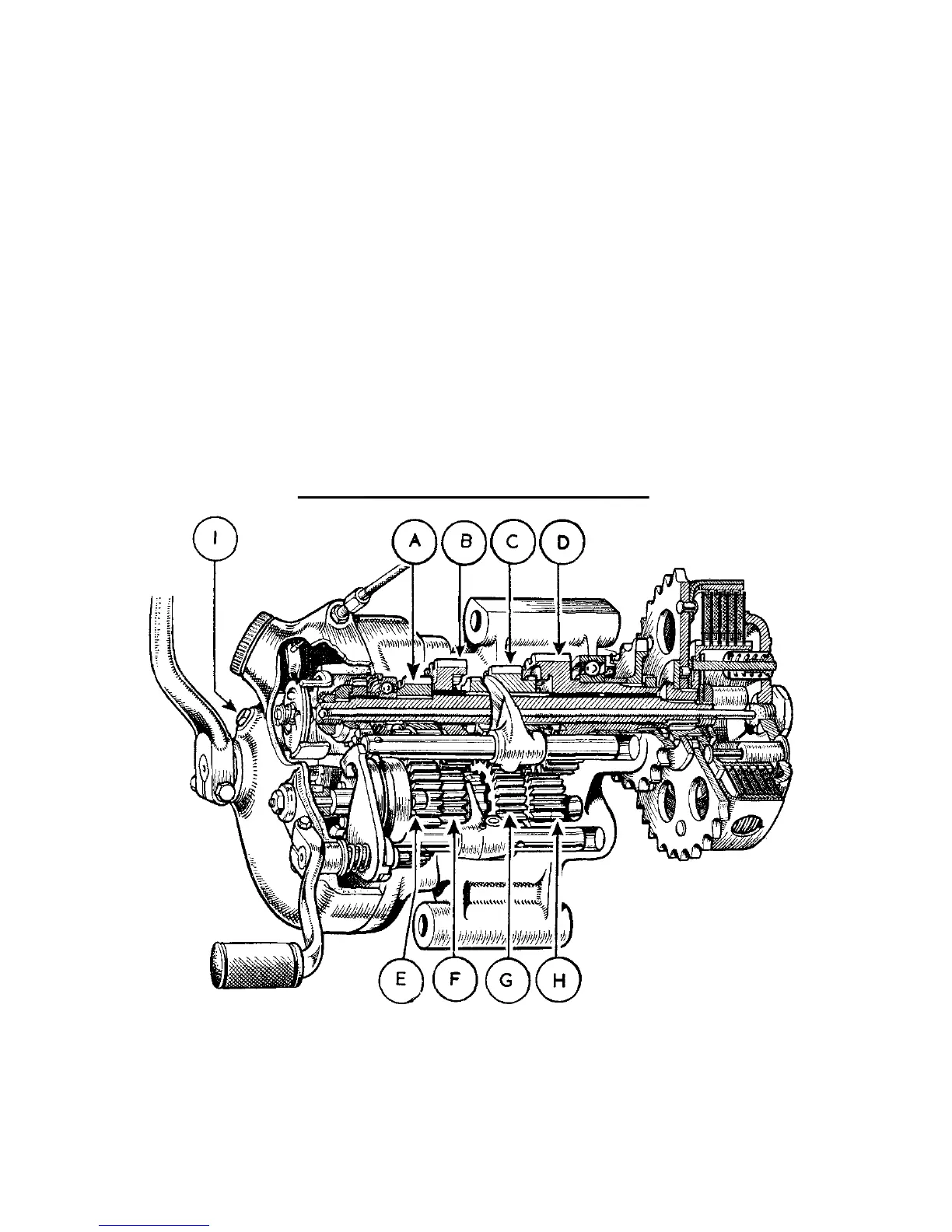 Section through gearbox showing gears and clutch with actuating mechanism