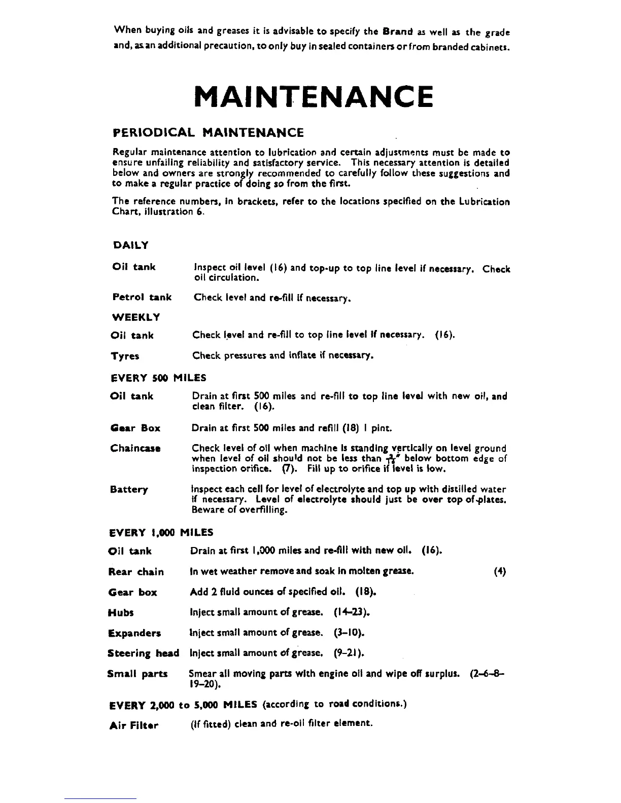Matchless G9 - Periodical Maintenance Schedule; Daily, Weekly, and 500-Mile Checks