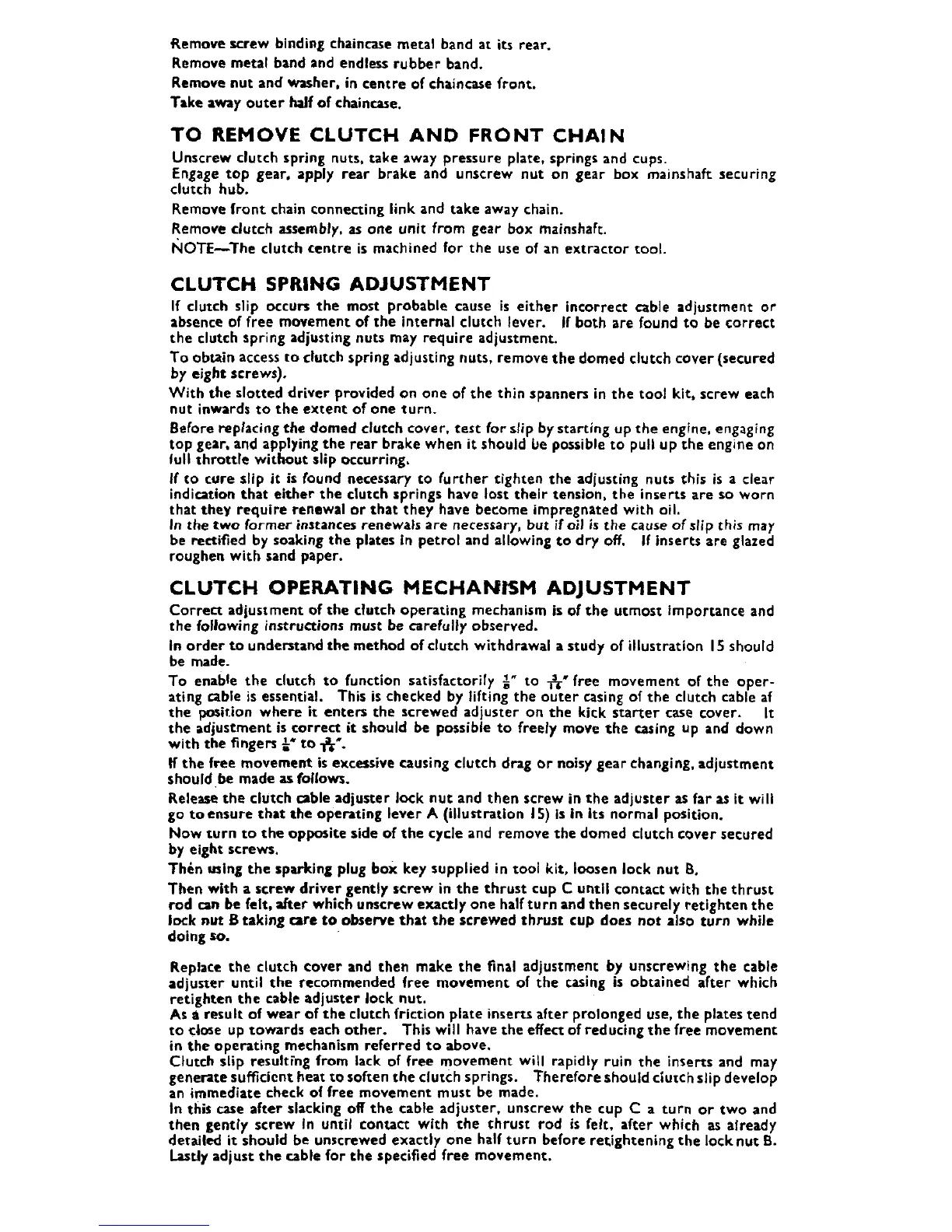 Matchless G9 - To Remove Clutch and Front Chain; Clutch Spring Adjustment; Clutch Operating Mechanism Adjustment