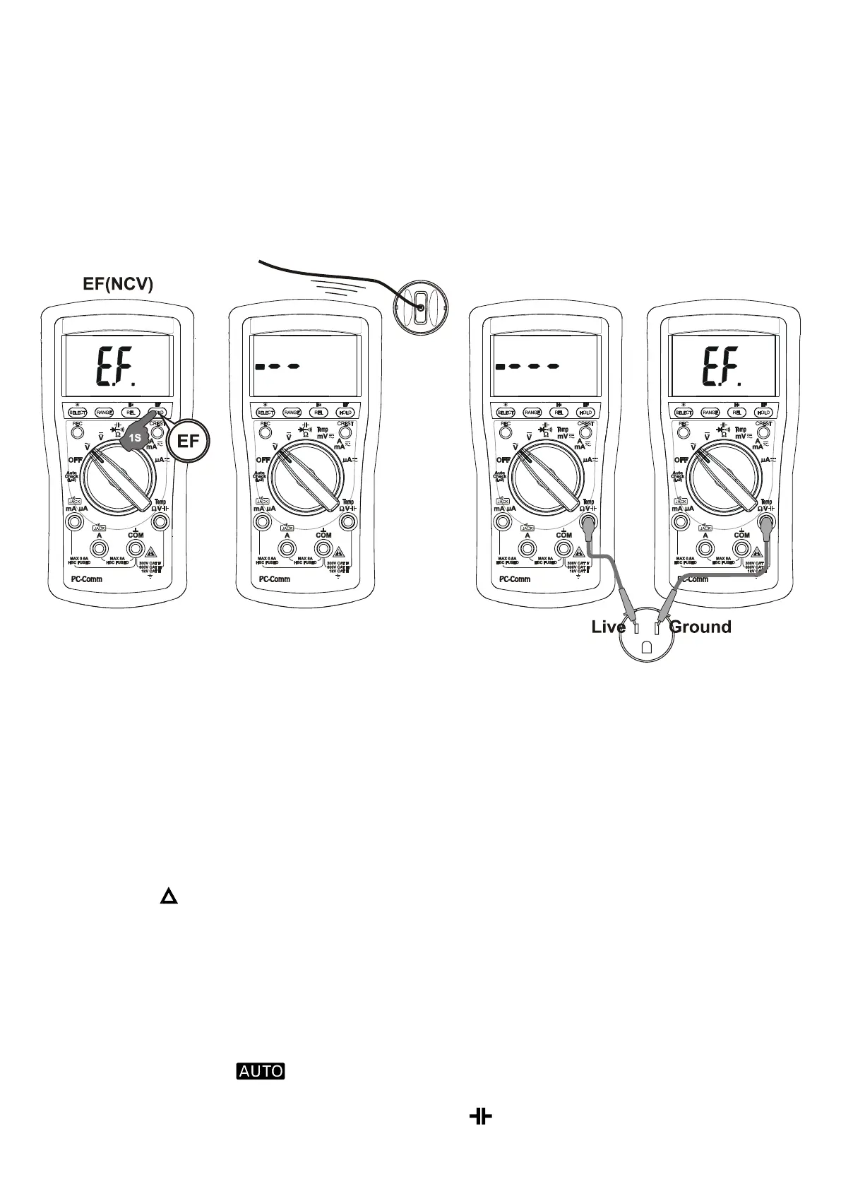 EF-Detection feature. The meter displays “E.F.” when it is ready. Signal strength is indicated as a