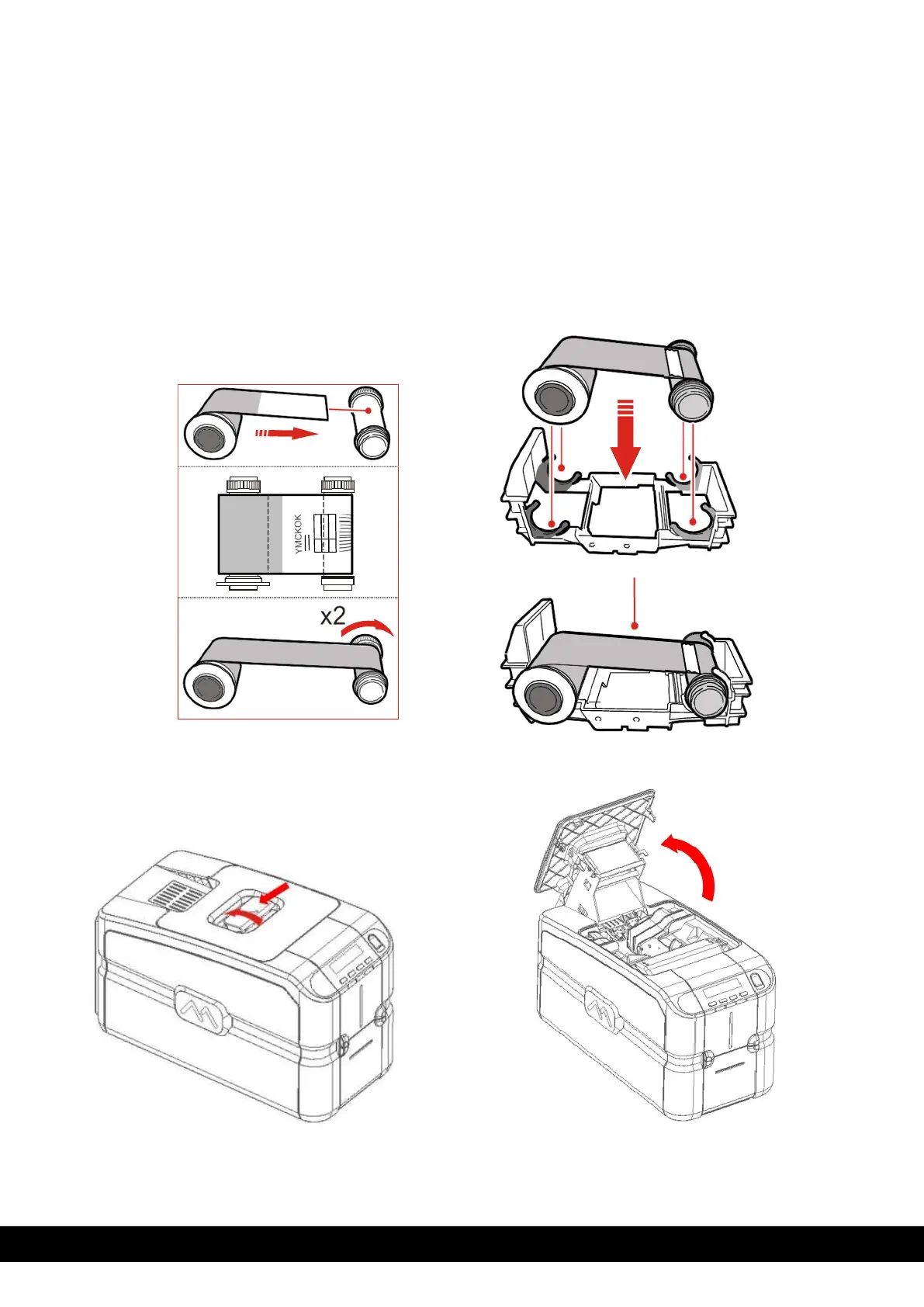 1) Installing the ribbon 2) Insert the ribbon (not provided with the printer)