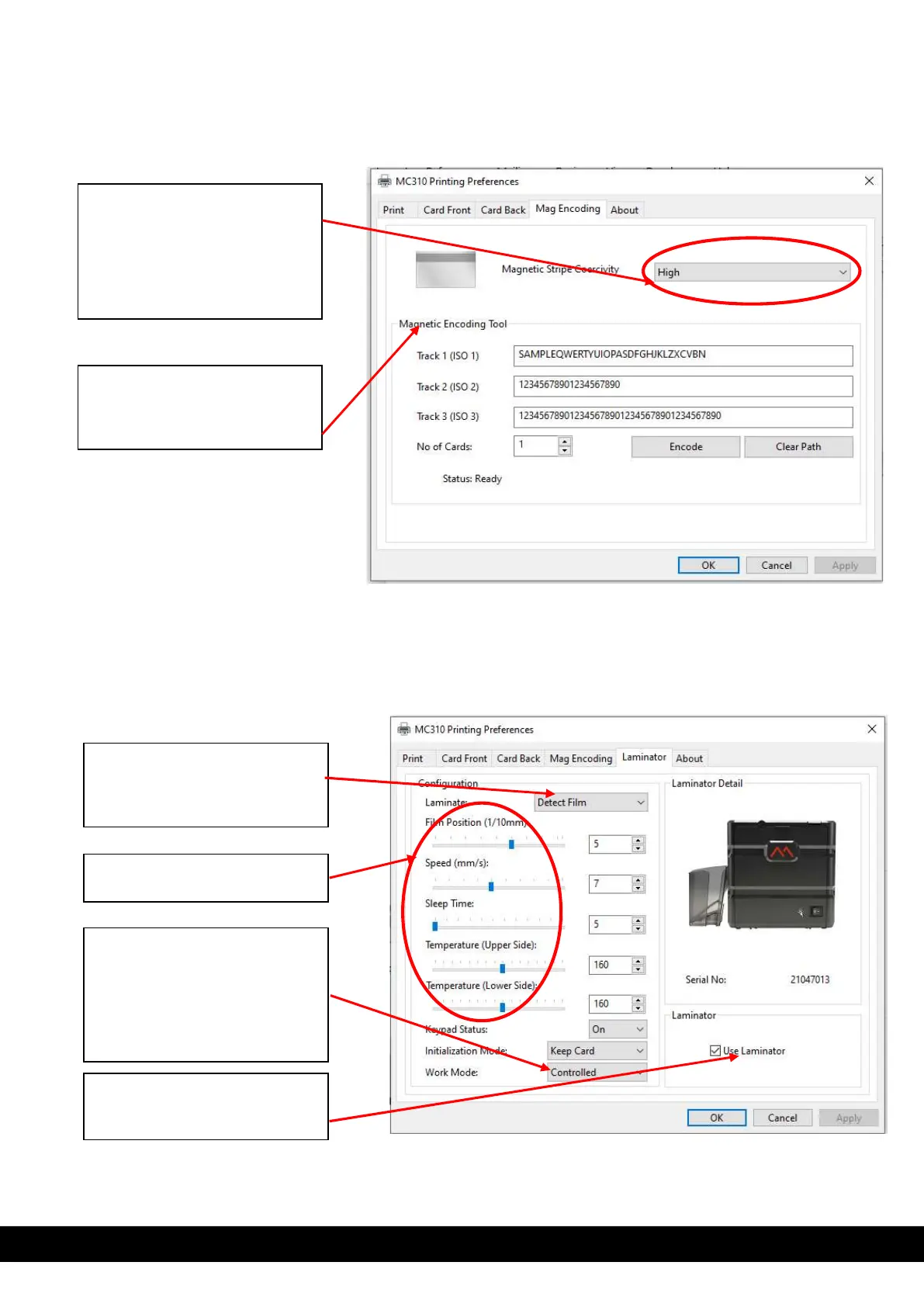 **Note: To use Laminator inline with MC310 printer, user need to select output card path as rear outbin.