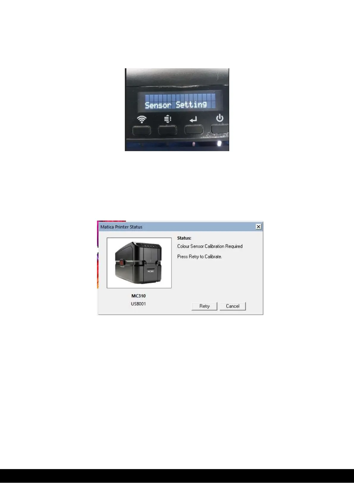 The printer LCD display shows sensor setting error (refer below photo) while using new YMCKO ribbon.