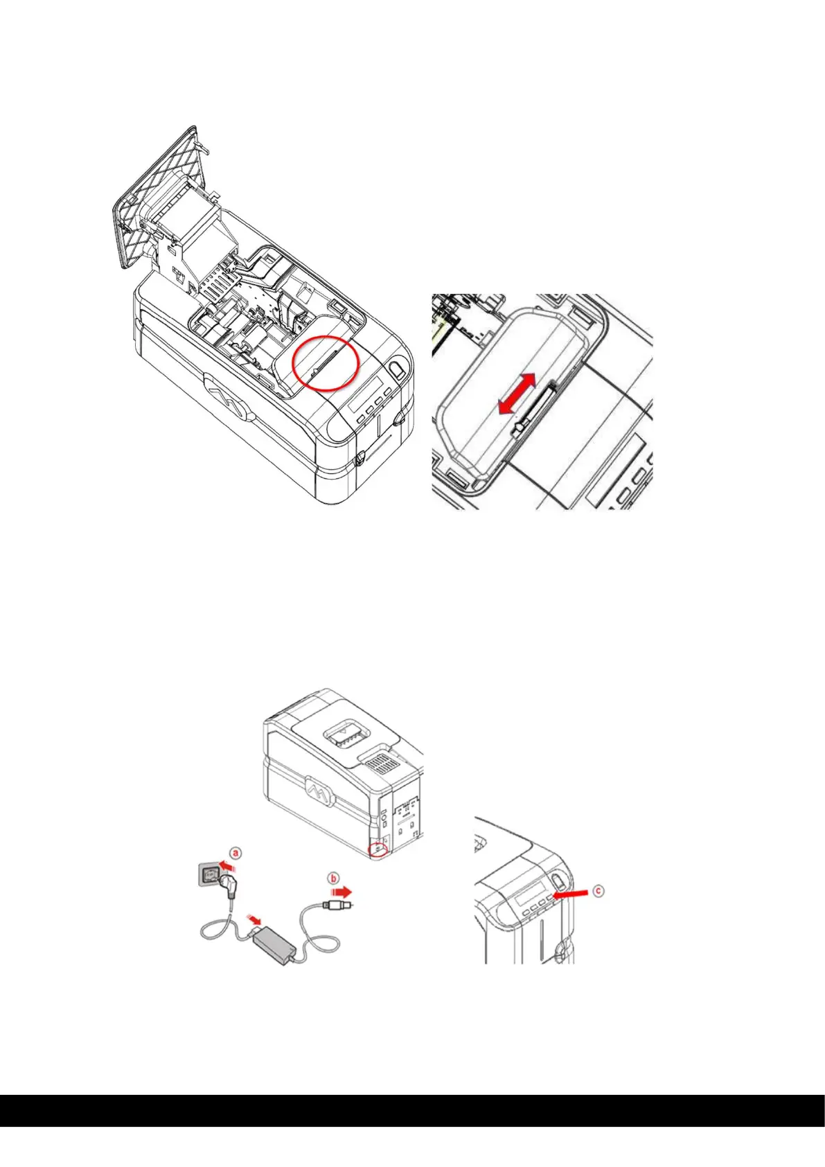 the printer (b) as shown below. Press the ON/OFF button (c) to power on the printer.
