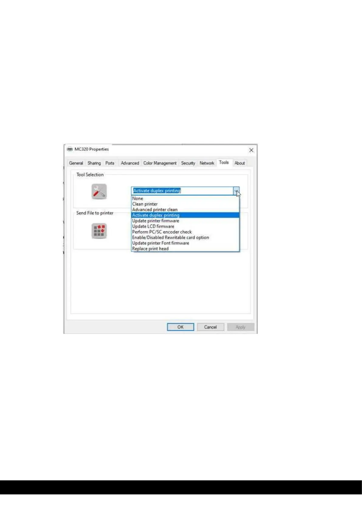 1. Go to Printer properties → Tools → select Activate Duplex printing from drop down menu→ Click