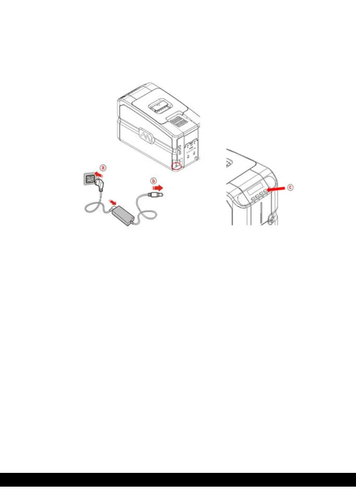 the printer (b) as shown below. Press the ON/OFF button (c) to power on the printer.
