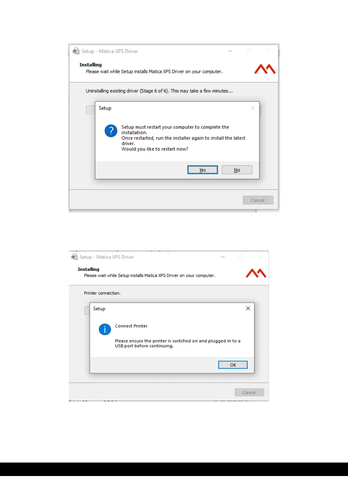 Ensure the printer is switched on and plugged into a USB port before clicking OK.