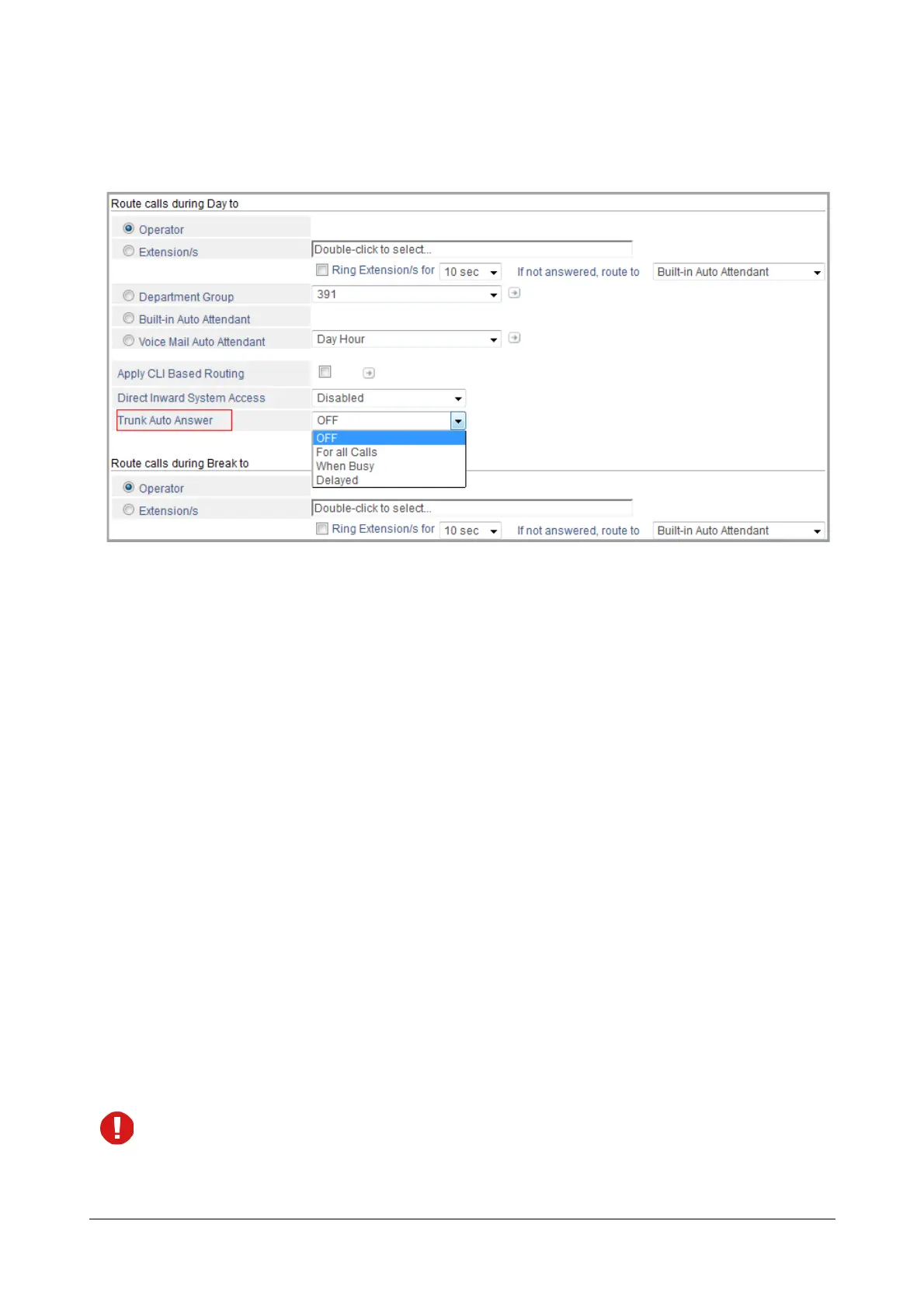 • Select the Type of Trunk Auto Answer for the Day, for Break and for the Night as: For all Calls or When