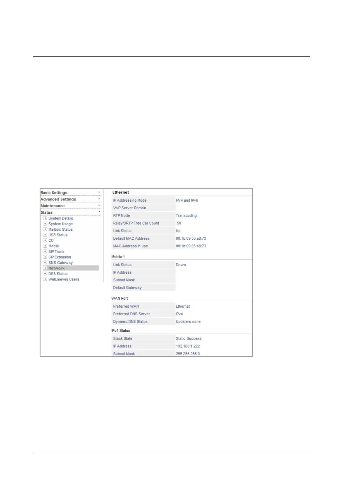 The Network Status Page displays the various network related details such as statuses of Ethernet Port, Mobile