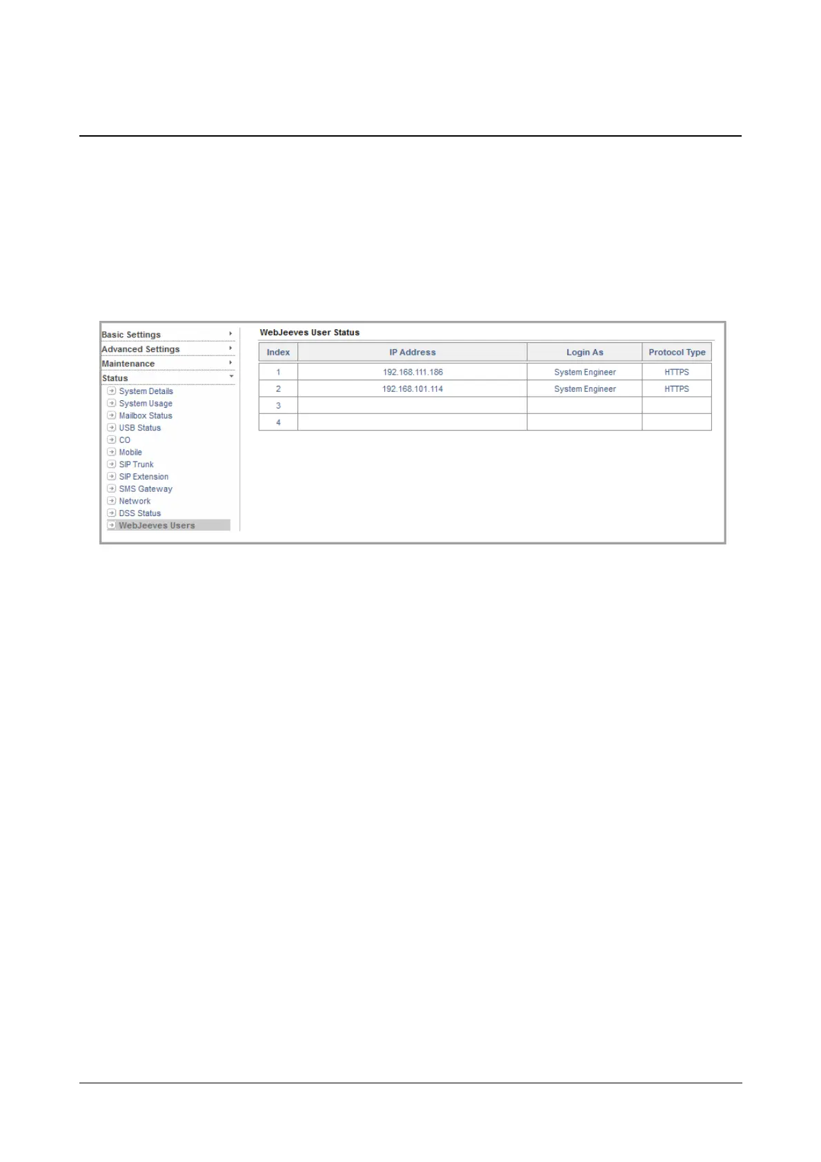 The WebJeeves Users Page displays the IP Address and Login Mode of the users accessing the Jeeves. It also