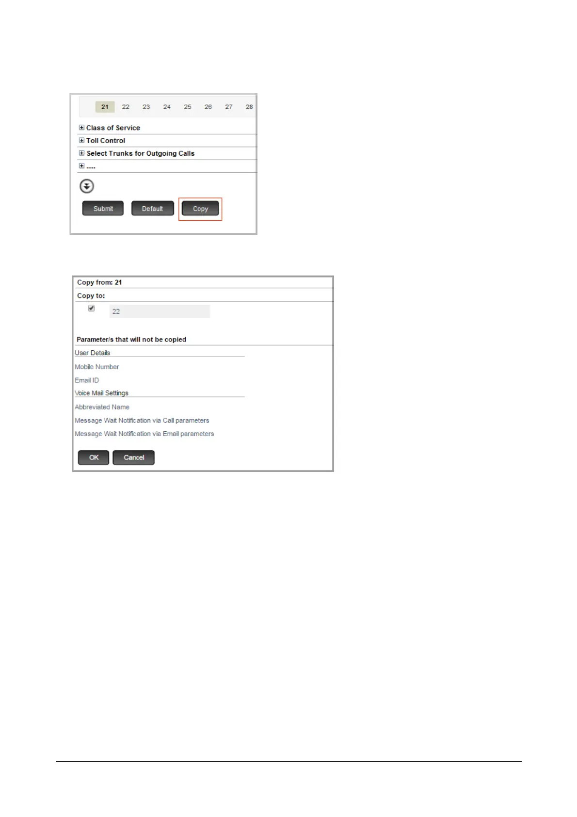 The copy page displays the number and/or name of the current extension in Copy from:. It also lists the