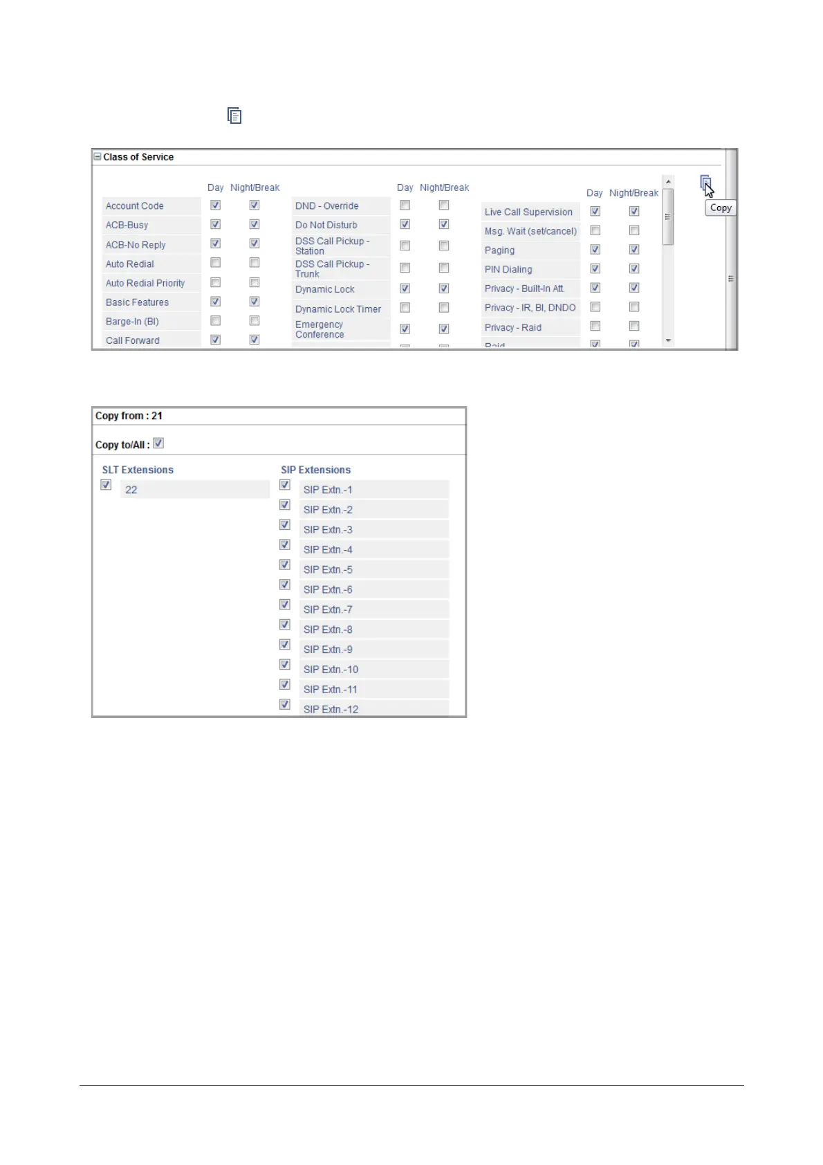 The Copy page displays the number and/or name of the current extension in Copy from:. It also lists the