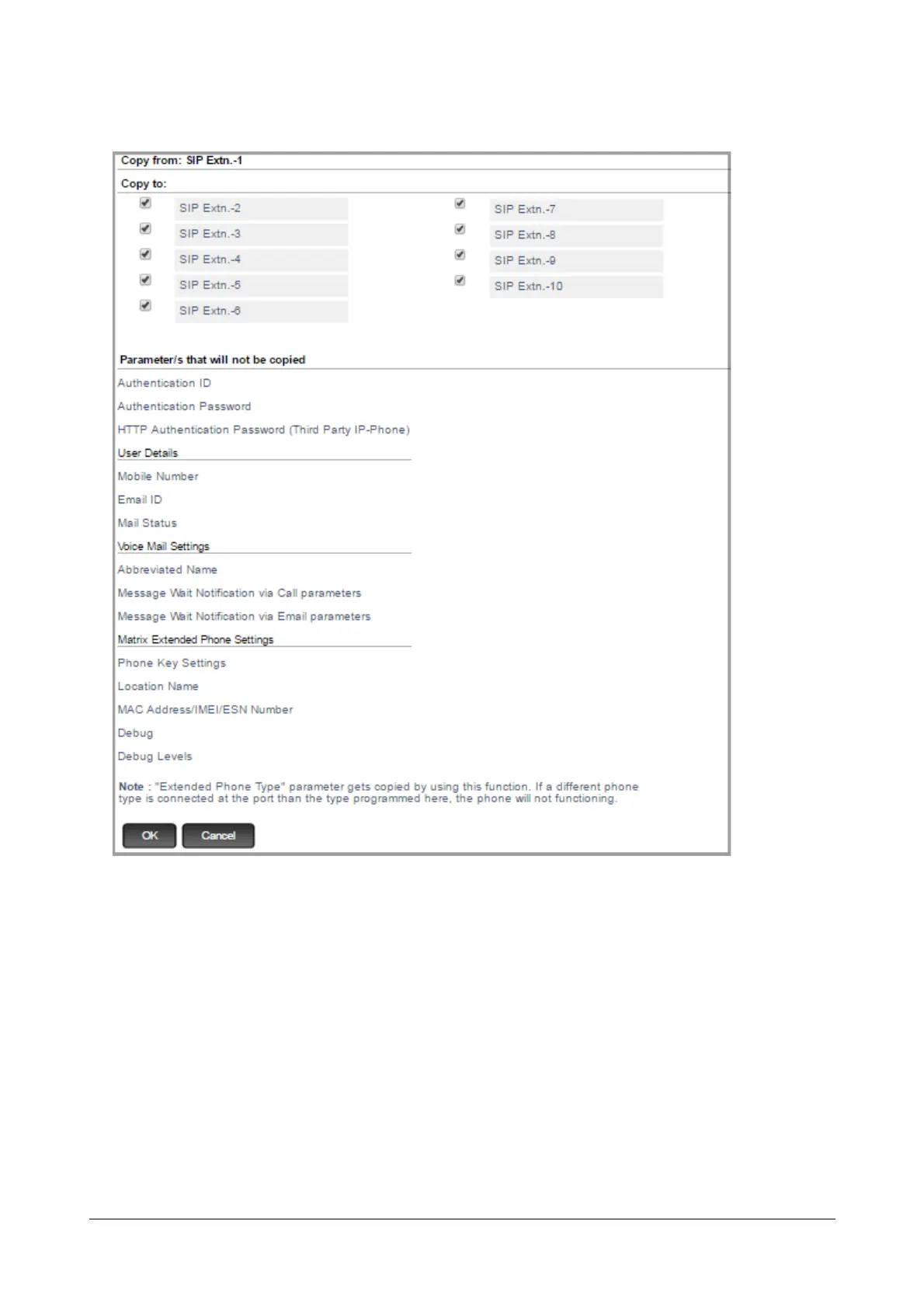 • Select the respective Copy to check boxes of the SIP Extensions to which you want to apply the current