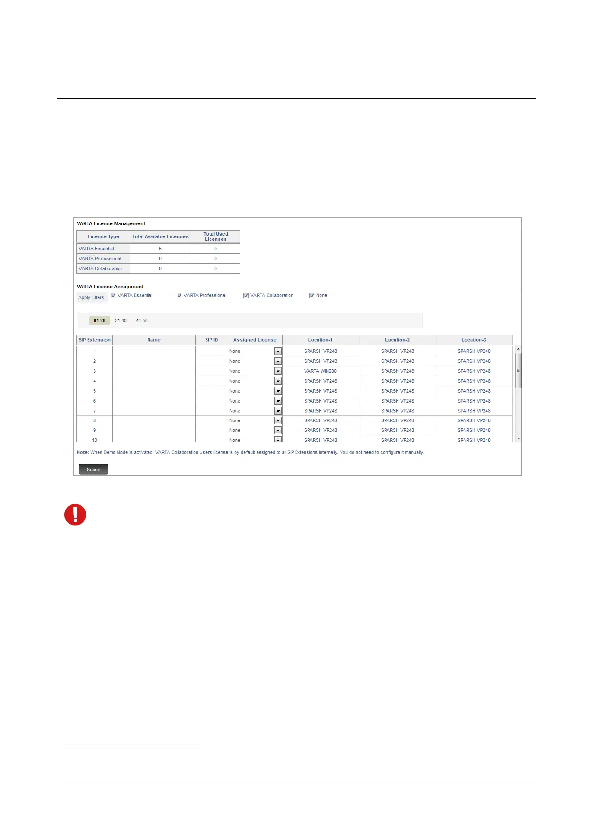When Demo Mode is activated, VARTA Collaboration license is assigned to all the SIP Extensions