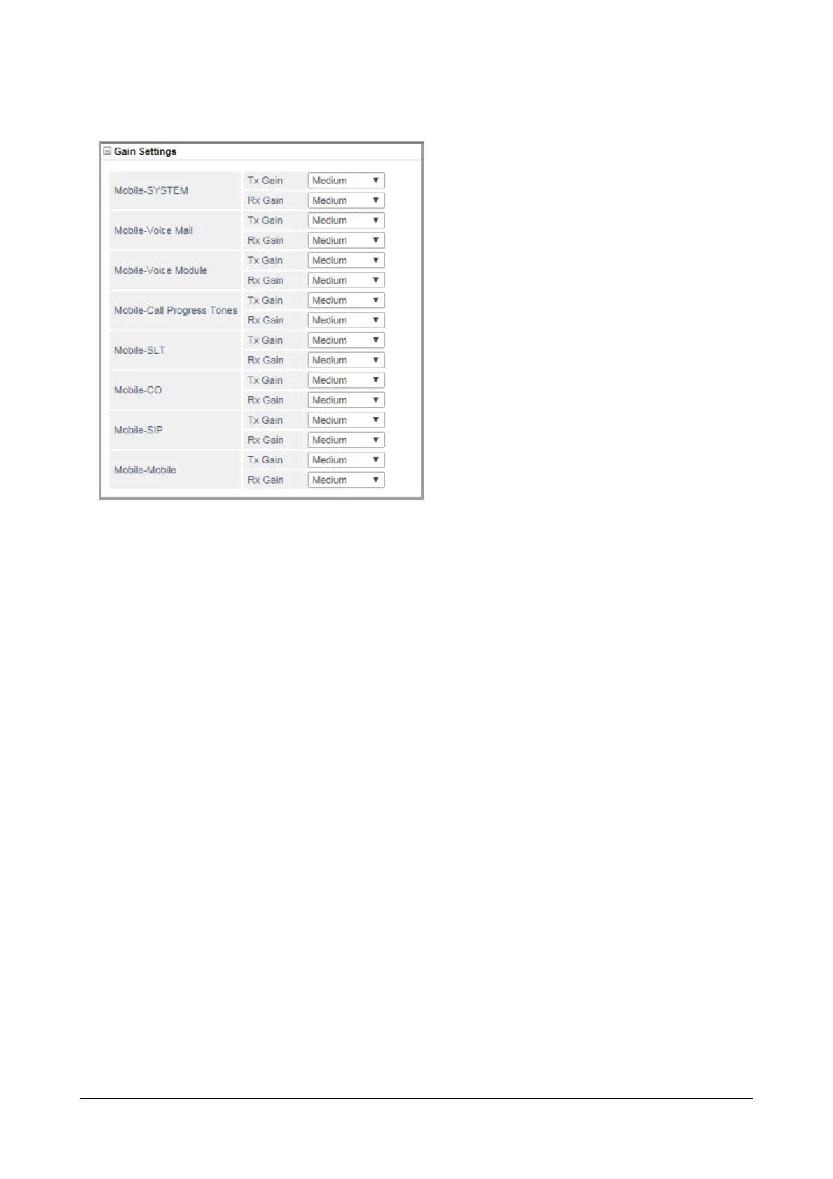 • Mobile - Voice Mail (Tx-Gain and Rx-Gain): Configure the Gain Setting that you want the system to