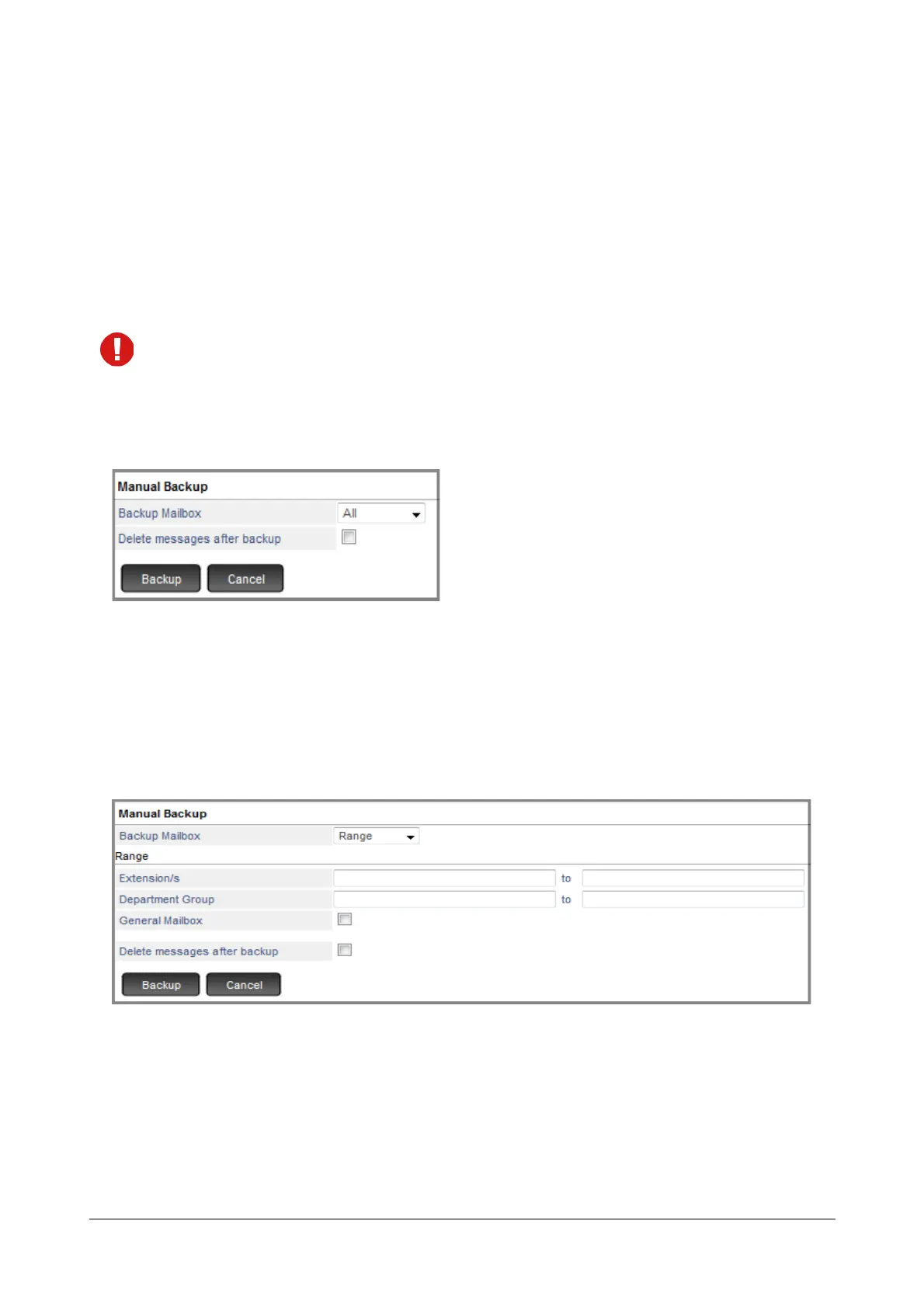 • To backup voicemail of multiple extensions in sequence, select Range.