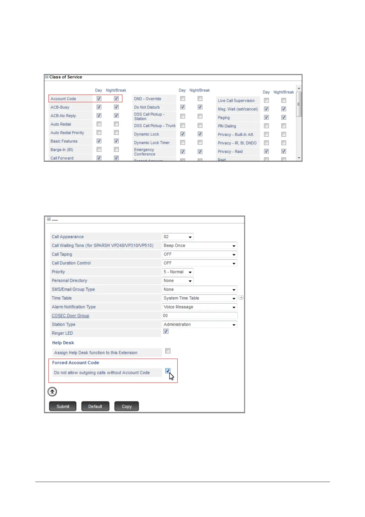 • Enable Account Code in the Class of Service for the Day and Night/Break.