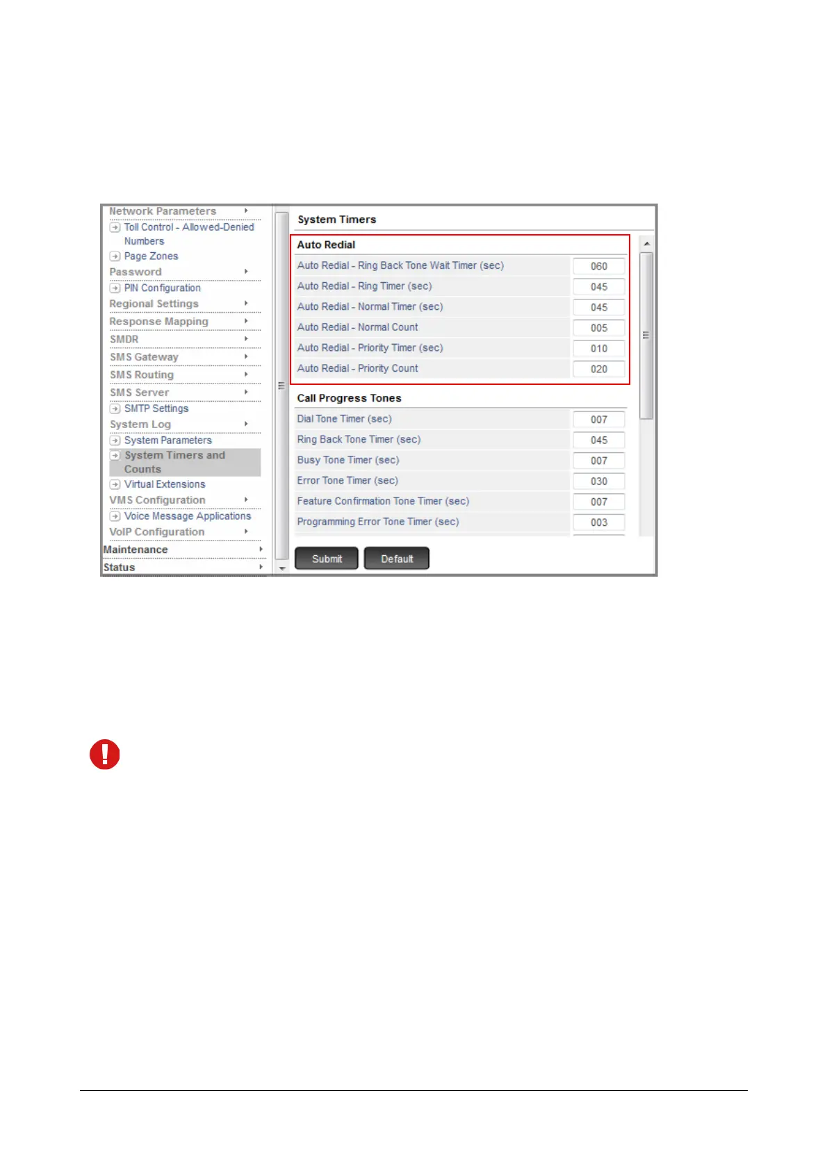 • The Timer for Auto Redial Normal as well as Priority must be set to more than 5 seconds.