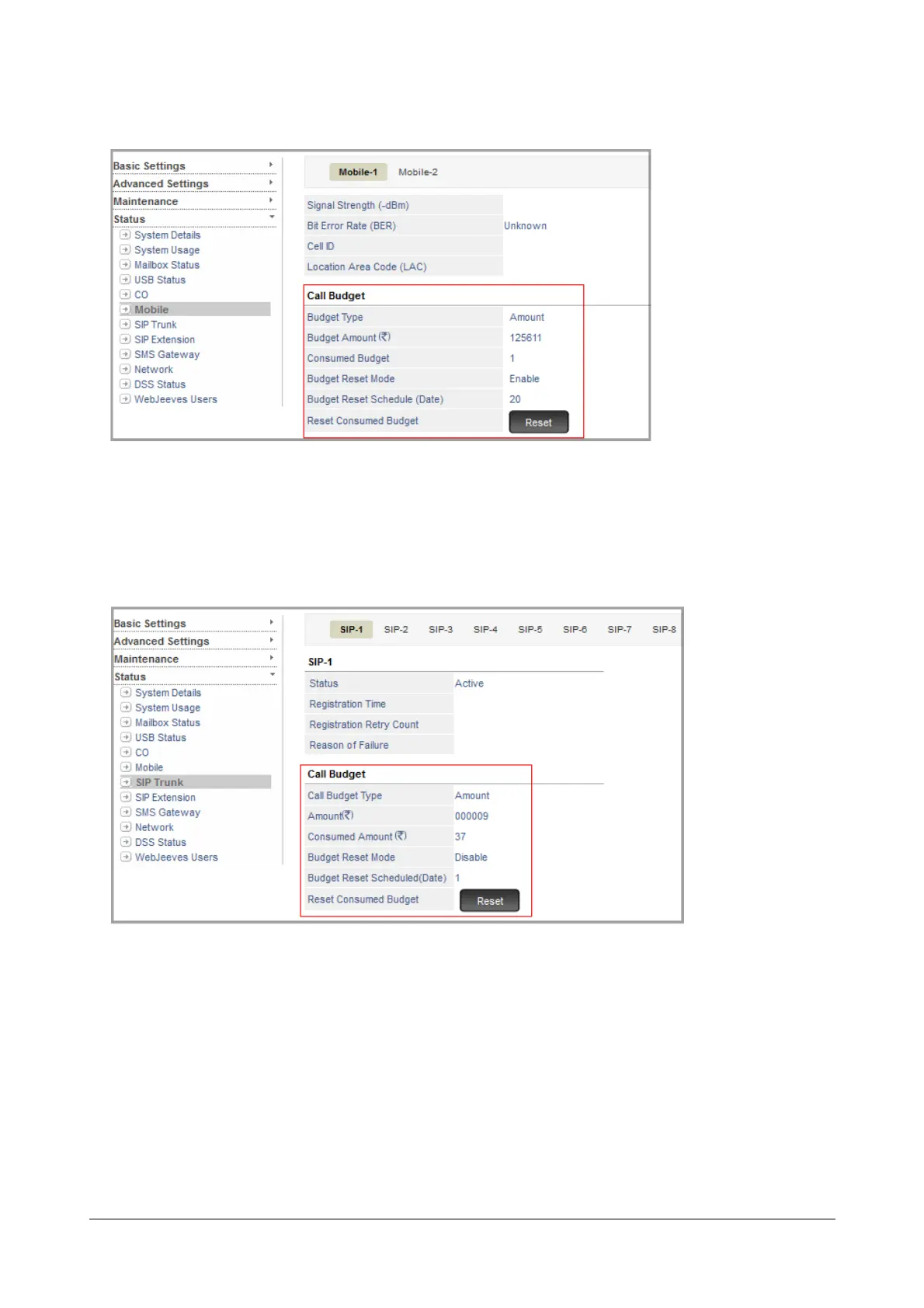 • To reset Call Budget manually, click the Reset button assigned to Reset Consumed Budget.