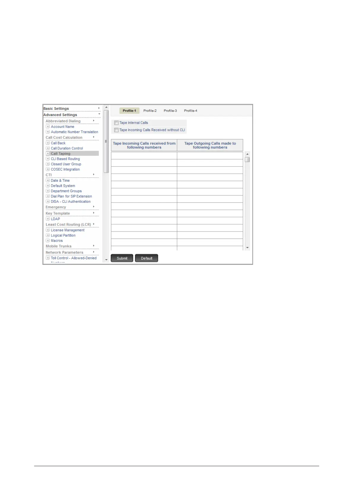 • To configure another Call Taping Profile, click the desired Profile number tab. Follow the same instructions