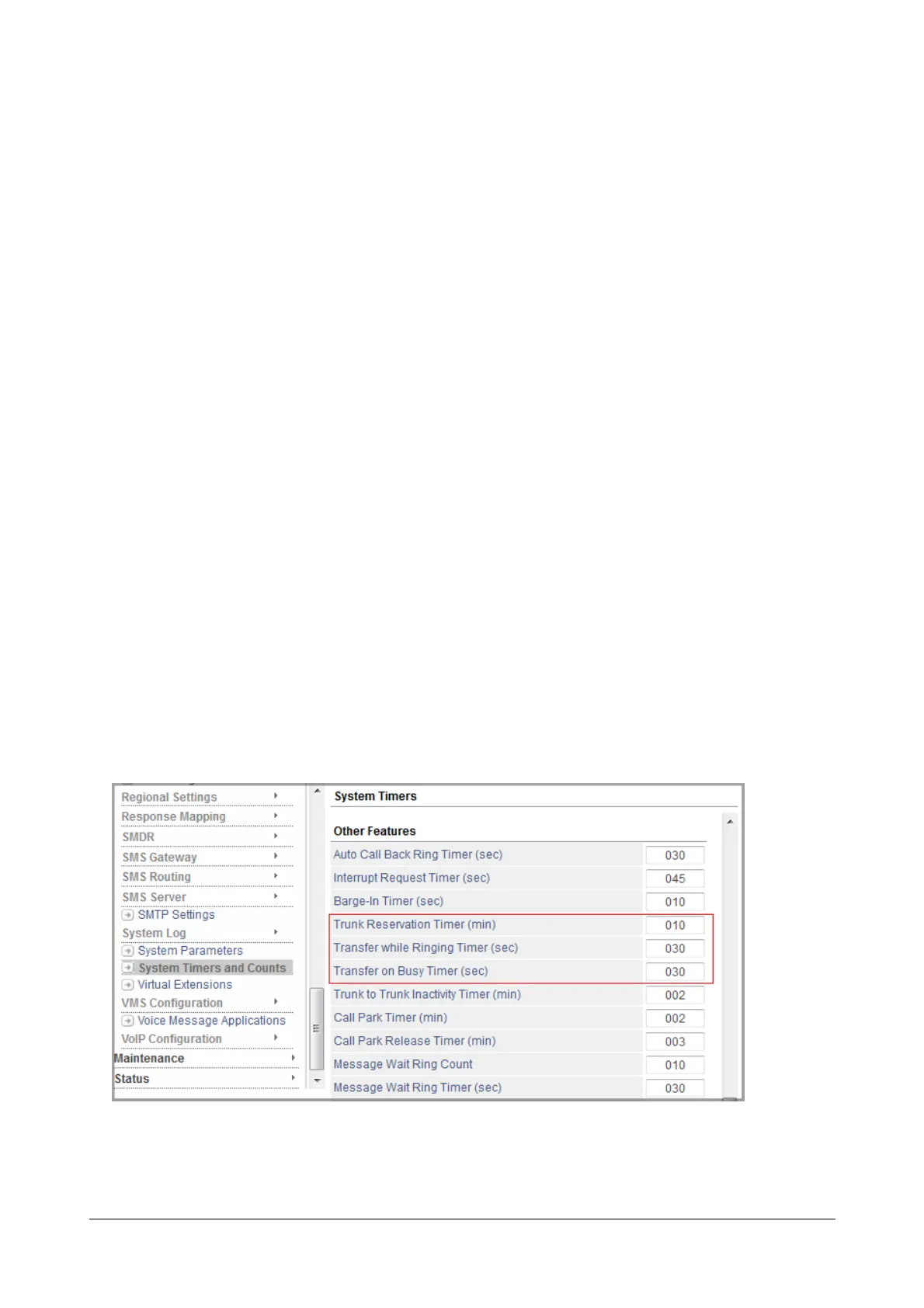• Transfer on Busy Timer: This timer is related to Call-Transfer on Busy. It is the time for which the system