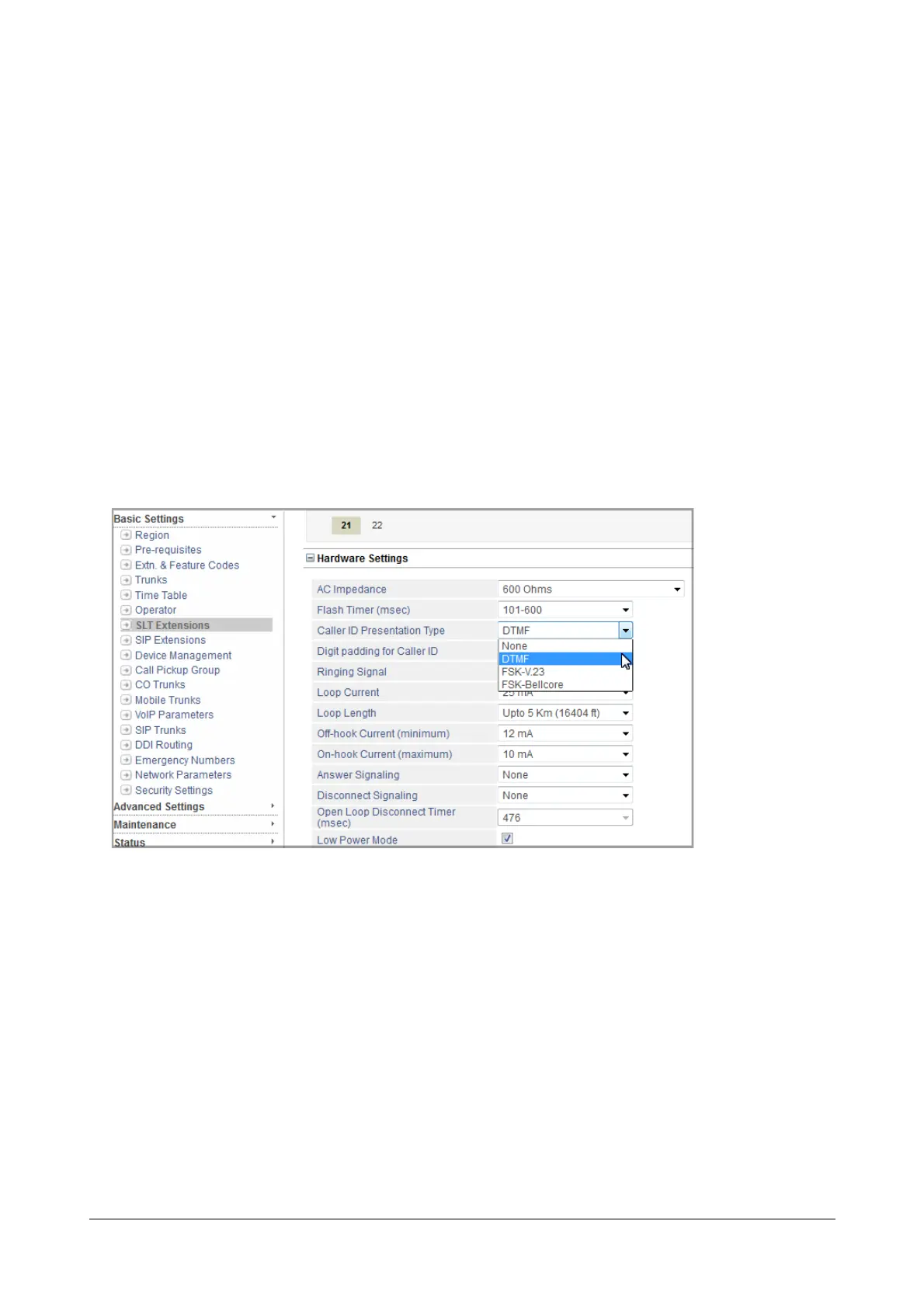 •As Caller ID Presentation Type, select the CLIP Type supported by the SLT: DTMF, FSK V.23, FSK-