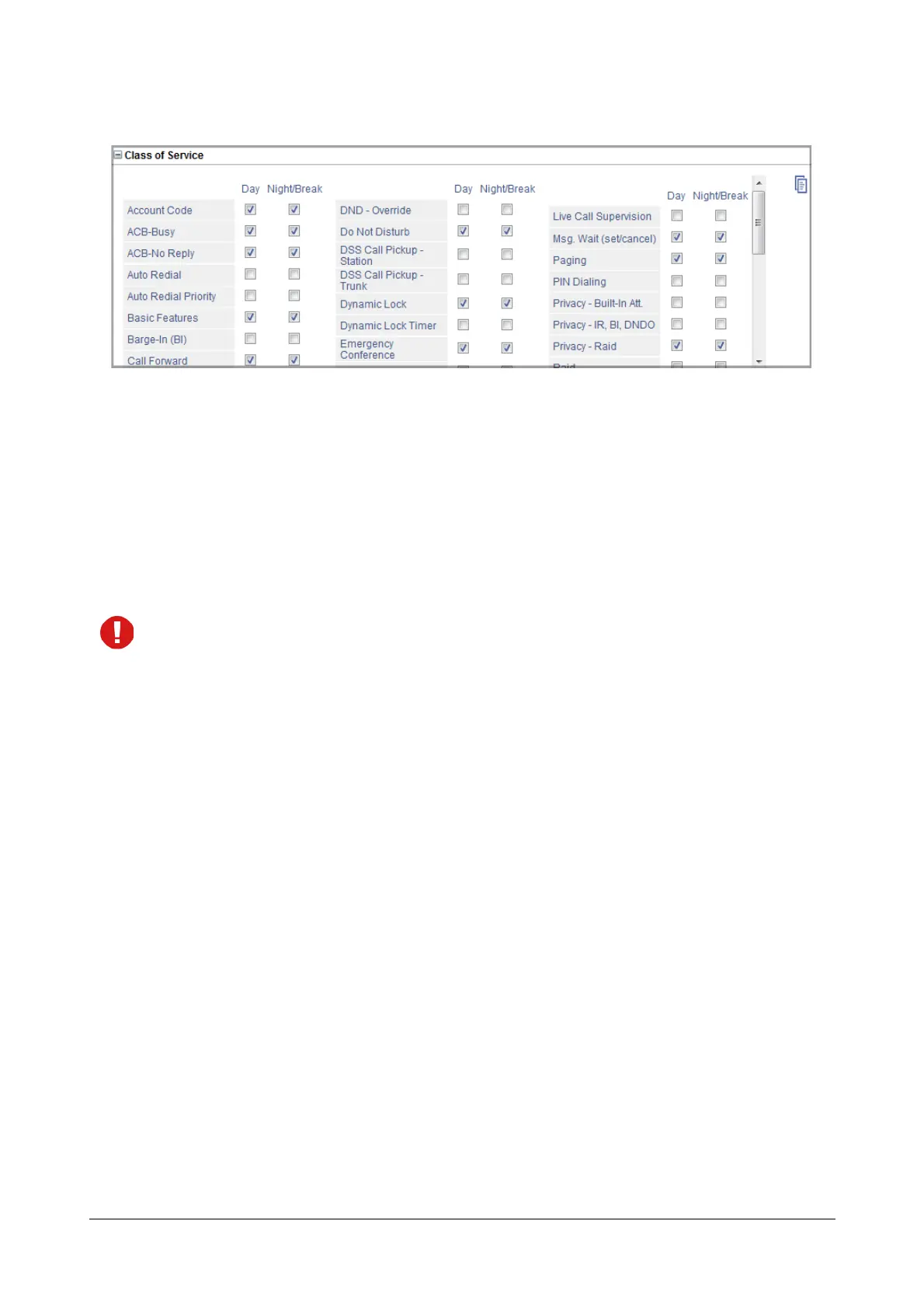 • The check boxes of features that are allowed for the Day and Night/Break are selected.
