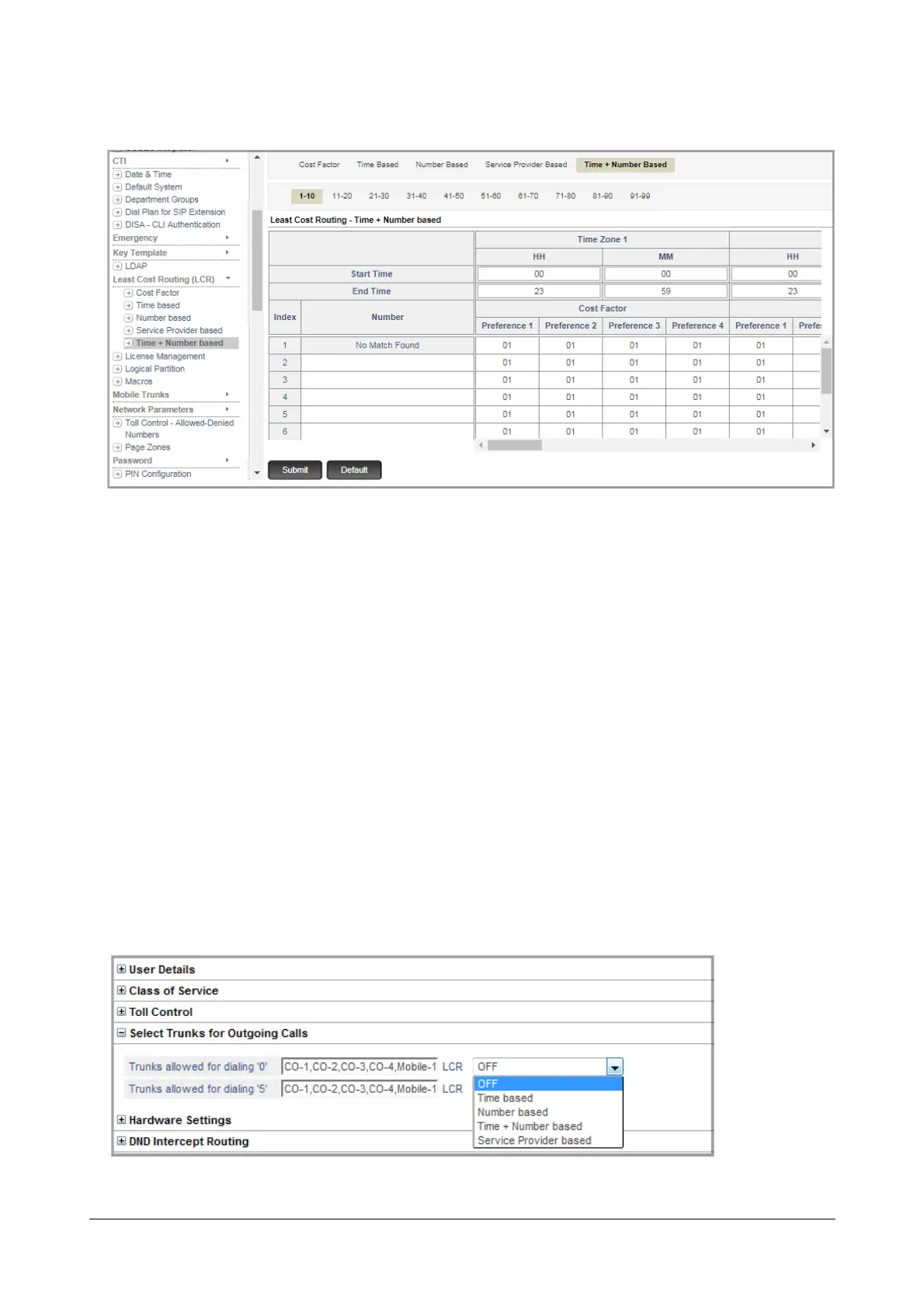 After assigning Cost Factor to trunks and configuring the LCR Type - Time based, Number based, Service Provider
