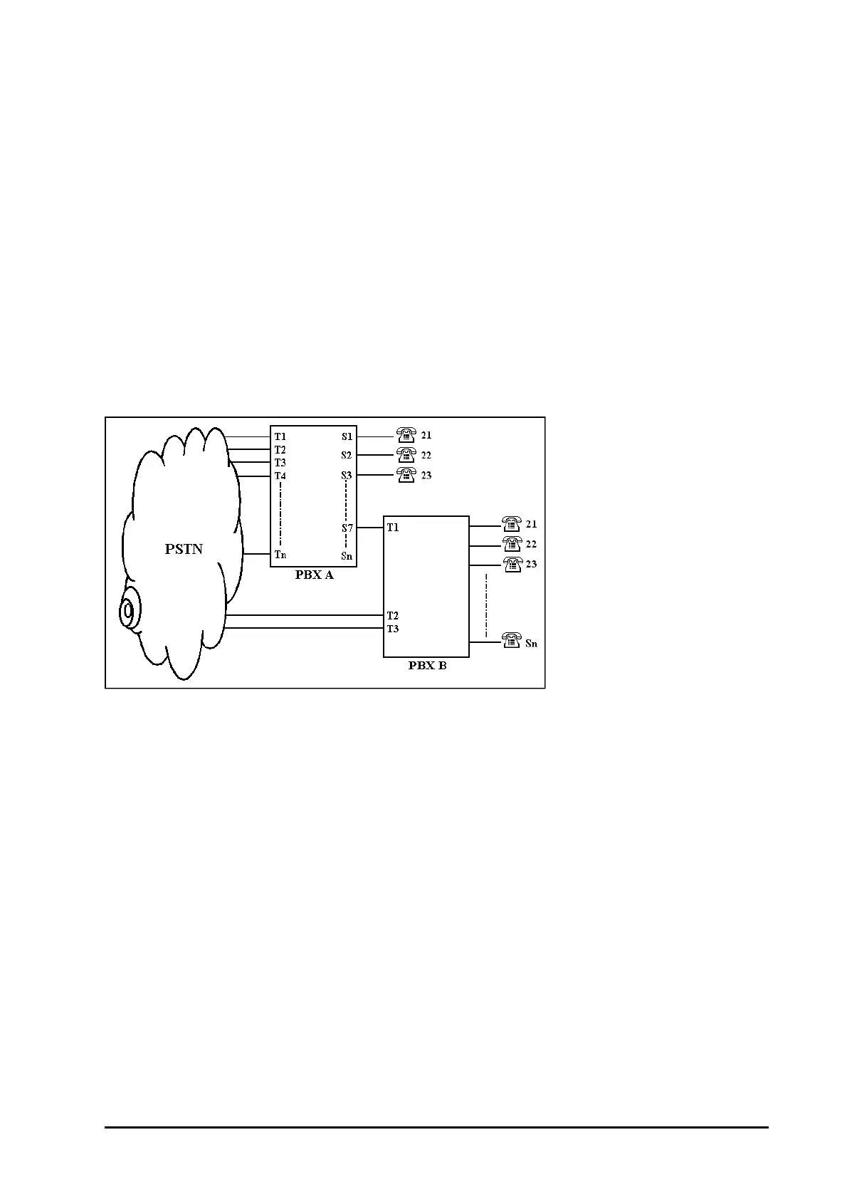 Station 21 of PBX B in the figure above is not given long distance dialing facility. It has access to all the trunks.