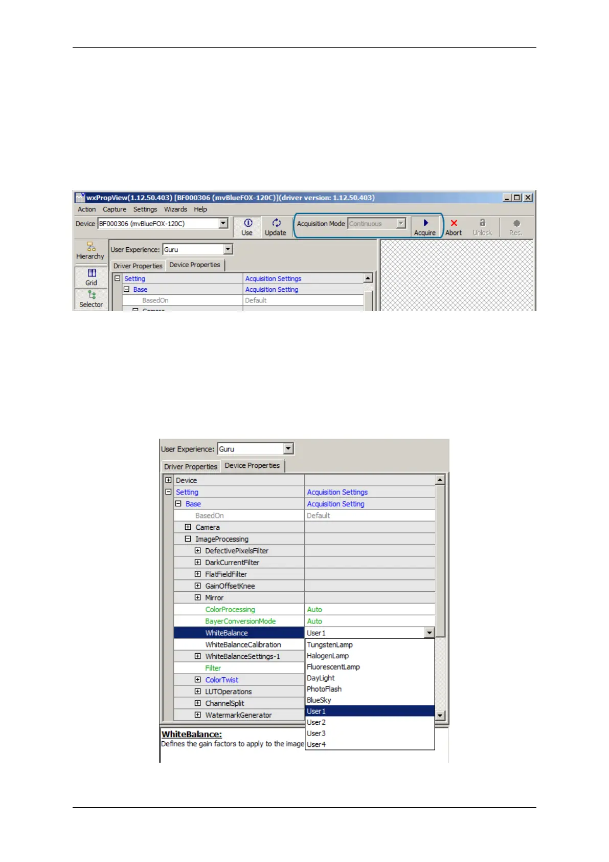 Start the wxPropView (p. 77) and initialize the device by clicking "Use" and start a "Continuous" acquisition.
