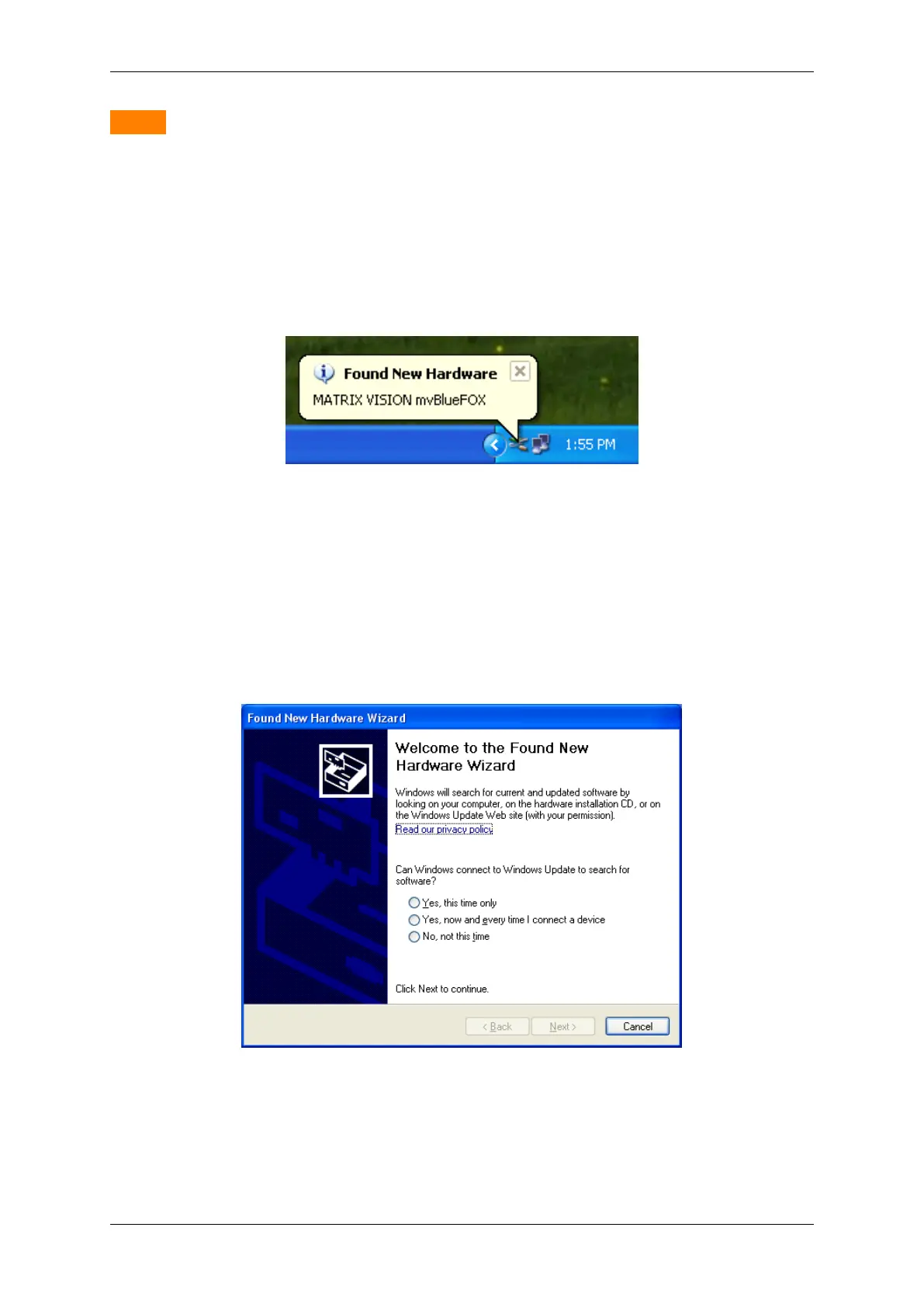 Plug the mvBlueFOX to an USB 2.0 Port. After plugging the mvBlueFOX Windows® shows "Found New Hardware"